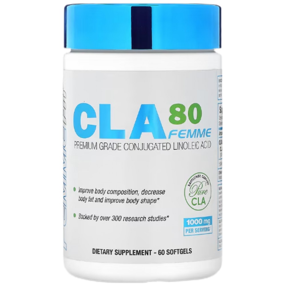 CLA80 Femme осигурява 80% от ключовите изомери, научно доказани, че подобряват телосложението, намаляват телесните мазнини и подобряват формата на тялото. Проучванията показват, че CLA също предлага многобройни ползи за здравето, включително има и противовъзпалителни свойства.