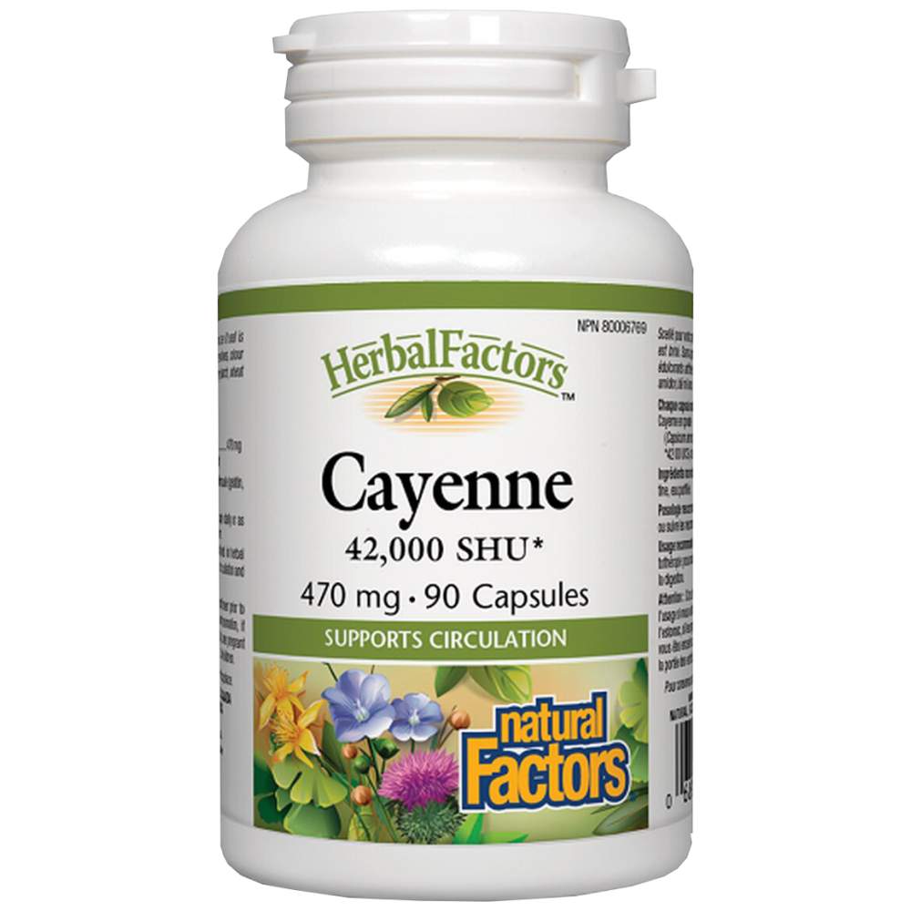 Natural Factors Cayenne 420 mg е висококачествена хранителна добавка, създадена да подпомогне вашето общо здраве и благосъстояние. Този продукт съдържа концентриран екстракт от кайенски пипер (Capsicum annuum), известен със своите многобройни ползи за организма. Кайенският пипер е богат на капсаицин – активна съставка, която придава характерната лютивина и е отговорна за терапевтичните свойства на растението. Предлага се под формата на лесни за поглъщане капсули, които осигуряват оптимална доза от 420 mg чист екстракт във всяка капсула.