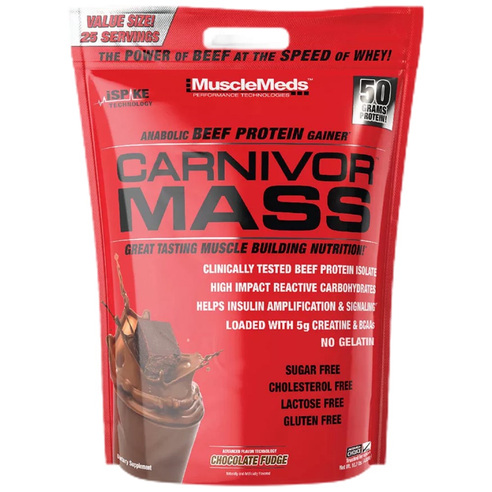 Говеждото се е доказало като анаболен протеин от векове. MuscleMeds е първата компания, която доставя на бодибилдърите телешки протеин изолат чрез своя патентована матрица, която доставя хранителни вещества и въздейства на инсулина подобно на суроватъчния протеин, но с дори по- голям анаболен ефект. Телешкият протеин в Carnivor Mass е 350% по- добре концентриран в аминокиселини, отколкото пържолата, по - концентриран е и от суроватъчния протеин, не съдържа мазнини или холестерол. Освен това, доставя 5 грама креатин и допълнителни BCAA за още по- голяма анаболна мощност.