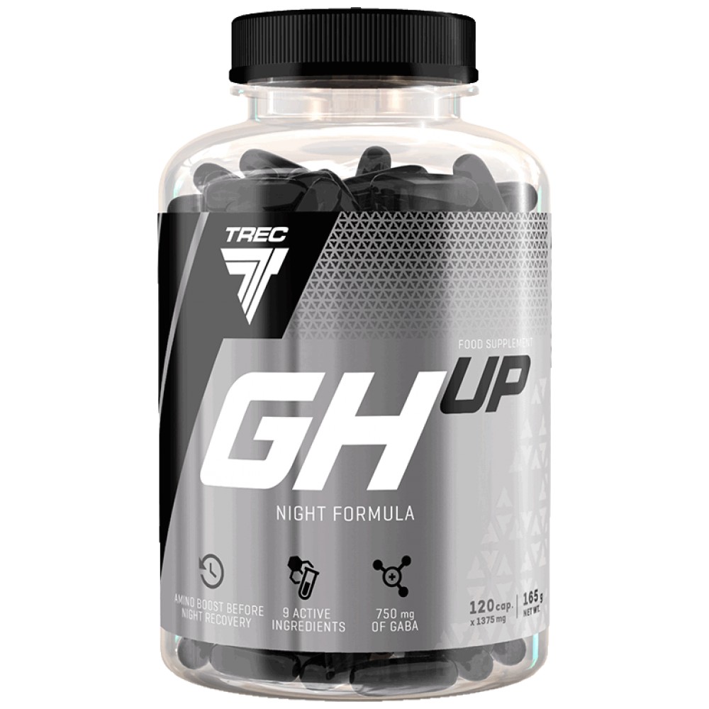 GH UP - NIGHT FORMULA е състав от аминокиселини, които са градивни елементи на полипептидната верига на соматотропин. GH UP съдържа L-аргинин, L-орнитин и L-лизин (AOL) с цитрулин малат. Продуктът е обогатен и с L-теанин, L-триптофан, L-глицин и L-глутамин. GH UP е продукт, препоръчван като средство, което допълва аминокиселините преди нощна регенерация.