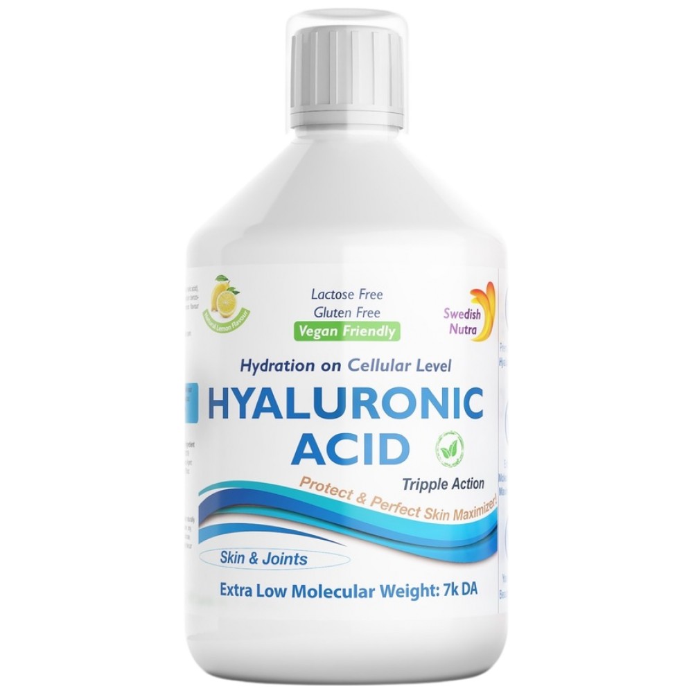 Swedish Nutra Хиалуронова киселина 100 мг - подхранване на клетъчно ниво. Едва 7000 далтона молекулно тегло, за максимално усвояване. Хиалуроновата киселина присъства във всяка тъкан от тялото ни. Най-силна концентрация е съсредоточена в съединителната тъкан, кожните клетки и ставния хрущял. Тя е съставна част на синовиалната течност (ставна течност), където служи за "смазка" между ставите, за да облекчи триенето помежду им. Хиалуроновата киселина се среща още в клапите на сърцето, стъкловидното тяло на окото, съединителната, епителна и нервна тъкан. Нашата формула включва, Хиалуронова киселина 100 мг, Витамин С 80 мг и Силика 15 мг. Течната хиалуронова киселина на Swedish Nutra е преработена в много ниско молекулно тегло едва 7000 далтона и се усвоява на 100% от организма!