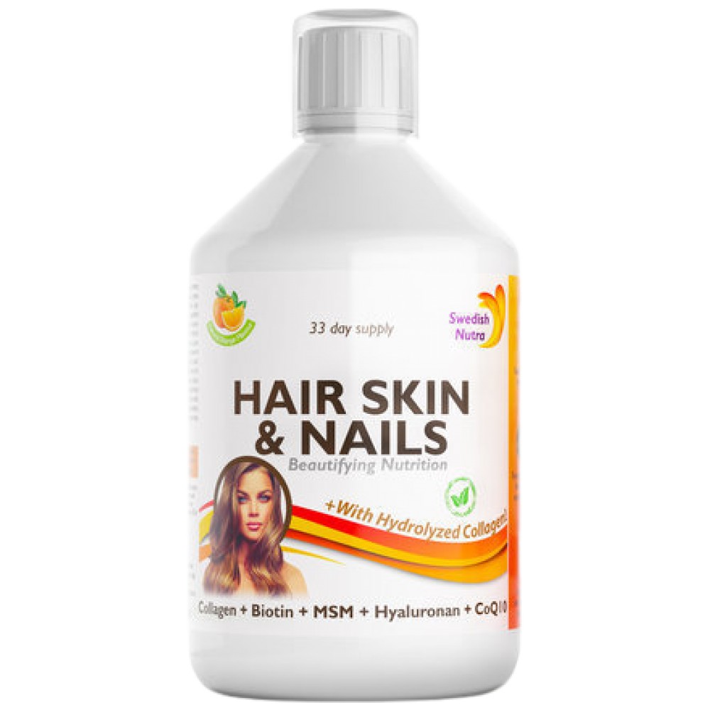 Swedish Nutra Skin Hair & Nails е специално формулирана течна добавка, снабдена с основни витамини, минерали, аминокиселини и колаген за здравословно производство на лъскава коса, здрава кожа и здрави нокти. Приемането на тази формула подпомага доброто кръвоснабдяване и транспортирането на хранителни вещества до различните части на тялото.