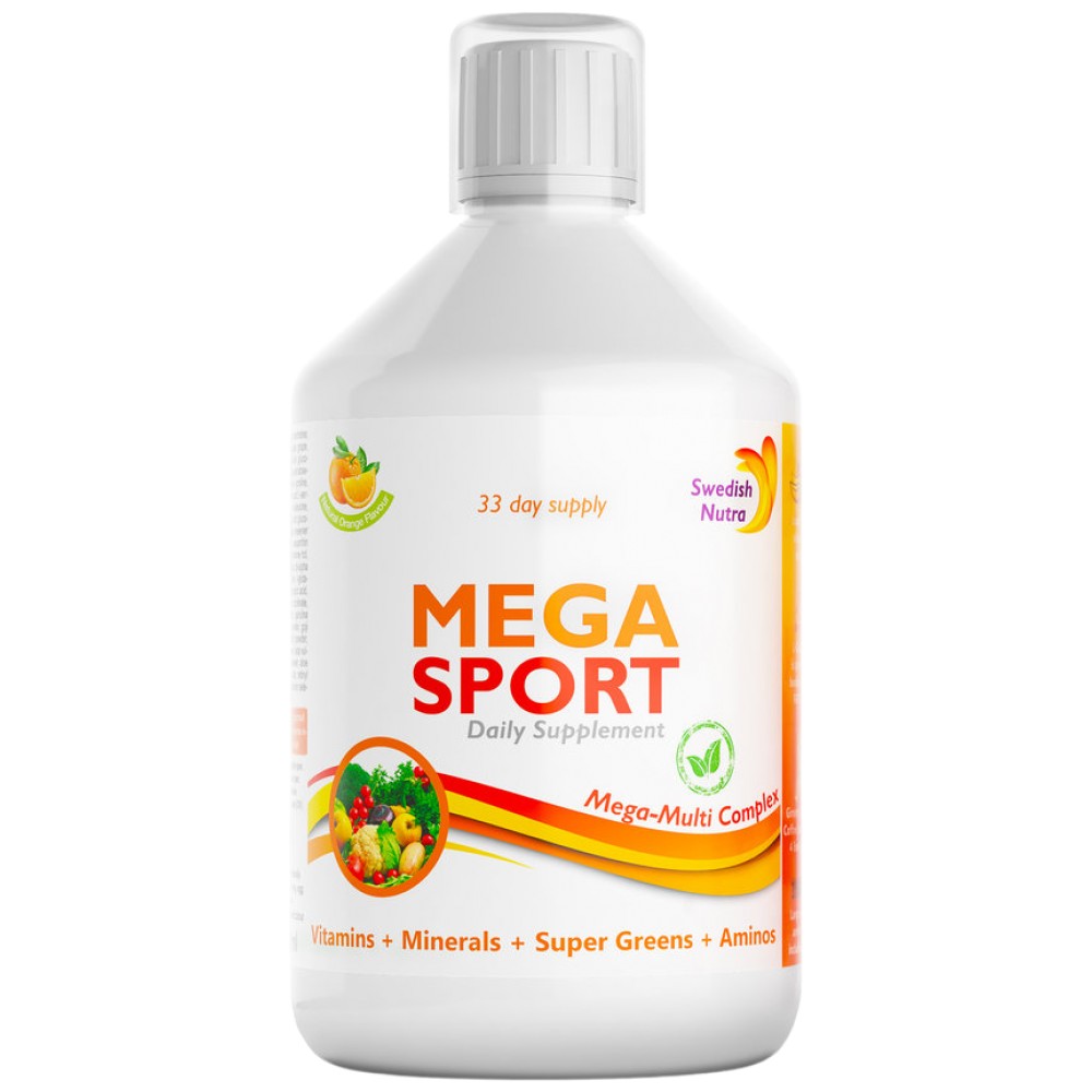 Витамини Мега Спорт са предназначени да подсилят тялото и организма при хора с интензивно ежедневие. Подходящи са при активно спортуващи, при хора подложени на тежък физически труд, системно чувство на умора и отпадналост, при хора със слаба имунна система и други. Богатия състав на течните витамини Мега Спорт, гарантира повече енергия през деня, по-силна имунна система, както и набавяне на жизнено важни витамини, минерали, аминокиселини и смес от зелени "супер" храни! Приемат се лесно, всяка сутрин по 15 мл, с приятен вкус на портокал. Една бутилка 500 мл е достатъчна за 33 дни.