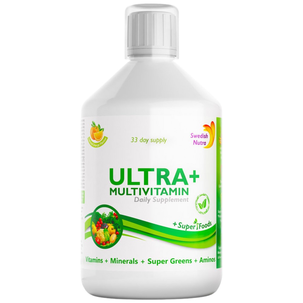 Ultra+ мултивитамини на Суидиш Нутра е един от най-продаваните ни мултивитамини. Ultra+ са вкусни и полезни течни мултивитамини с вкус на портокал с уникална формула, базирана на доказателства, с над 30 активни хранителни вещества за ежедневна хранителна подкрепа и с добавени аминокиселини от колаген (147 мг). Съставихме мощна формула, която действително работи.