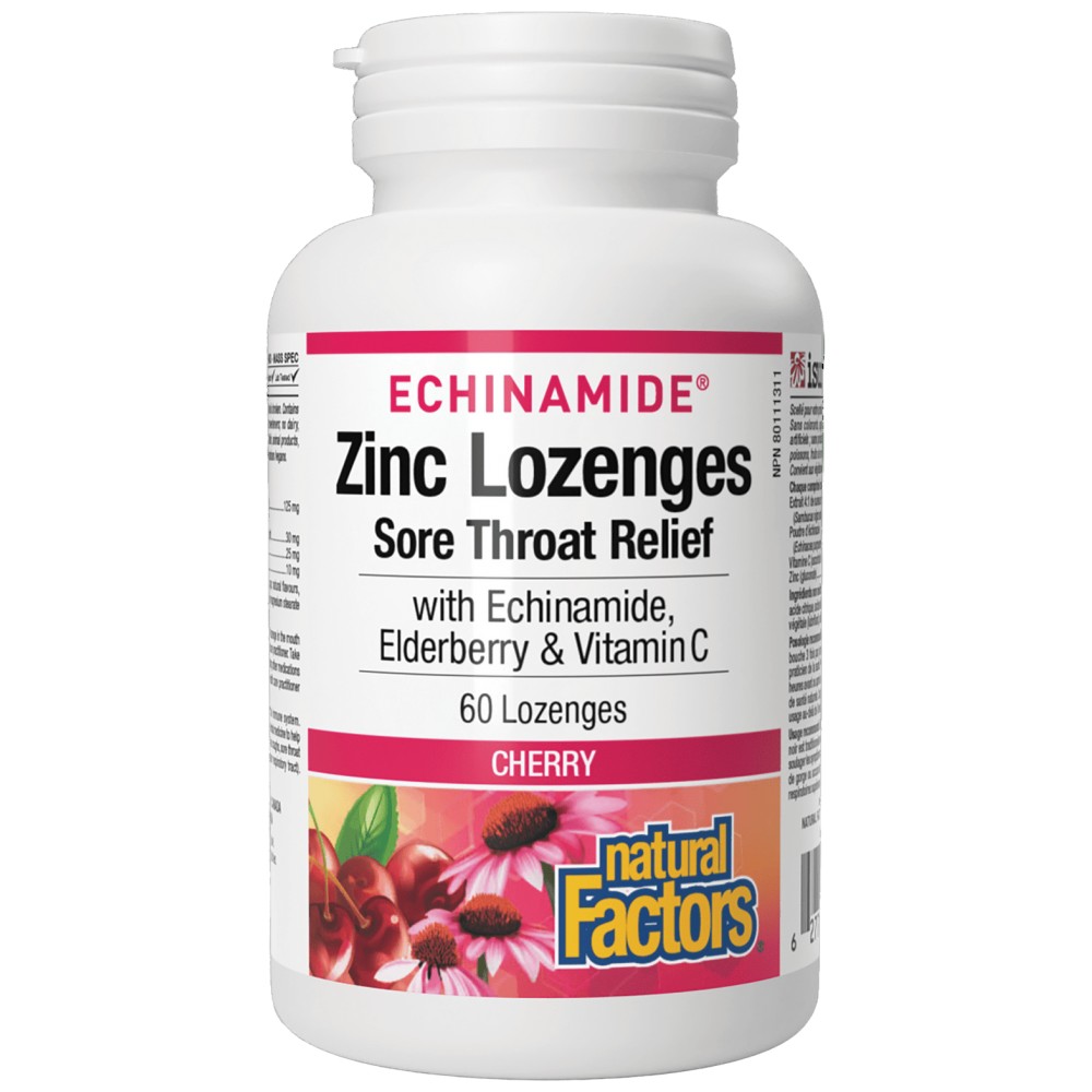 Echinamide Zinc Lozenges Sore Throat Relief от Natural Factors е революционен продукт за облекчаване на болките в гърлото, съчетаващ силата на цинк и органичен екстракт от ехинацеа. Тези лозенги са специално разработени за бързо и ефективно облекчение на симптомите на гърлено възпаление, кашлица и други признаци на простуда или грип. Формулирани в приятни за употреба лозенги с вкус на череша, те предлагат удобен и вкусен начин за поддръжка на имунната система и за успокояване на раздразнено гърло. Ехинацеата, използвана в тези лозенги, е клинично доказана за подкрепа на имунната функция, докато цинкът е известен с антивирусните си свойства и способността си да съкращава продължителността на простудните заболявания.