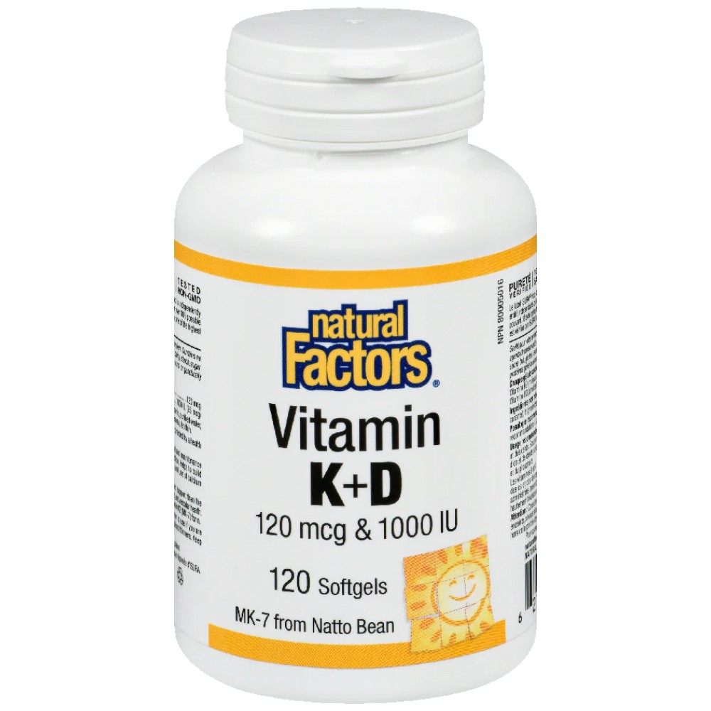Natural Factors Vitamin K2 120 mcg & D3 1000 IU е премиум добавка, разработена за оптимална поддръжка на здравословието на костите и сърдечно-съдовата система. Този продукт е формулиран в удобна капсулна форма, съчетаване на две ключови микронутриенти - витамин К2 в най-биоактивната му форма, менахинон-7 (MK-7), и витамин Д3 (холекалциферол), за да работят синергично за вашето здраве. Витамин К2 MK-7, извлечен от ферментирана соя, е известен за ролята си в насочването на калция към костите, вместо към артериите, докато витамин Д3 подпомага абсорбцията на калций от хранителните продукти. Тази синергия не само поддържа здравословната костна плътност и зъби, но и предотвратява калцификация на артериите, защитавайки сърдечно-съдовата система. Без ГМО, без глутен, без изкуствени добавки, този продукт е идеален за всеки, който цени чистота, качество и ефективност в здравословното хранене.