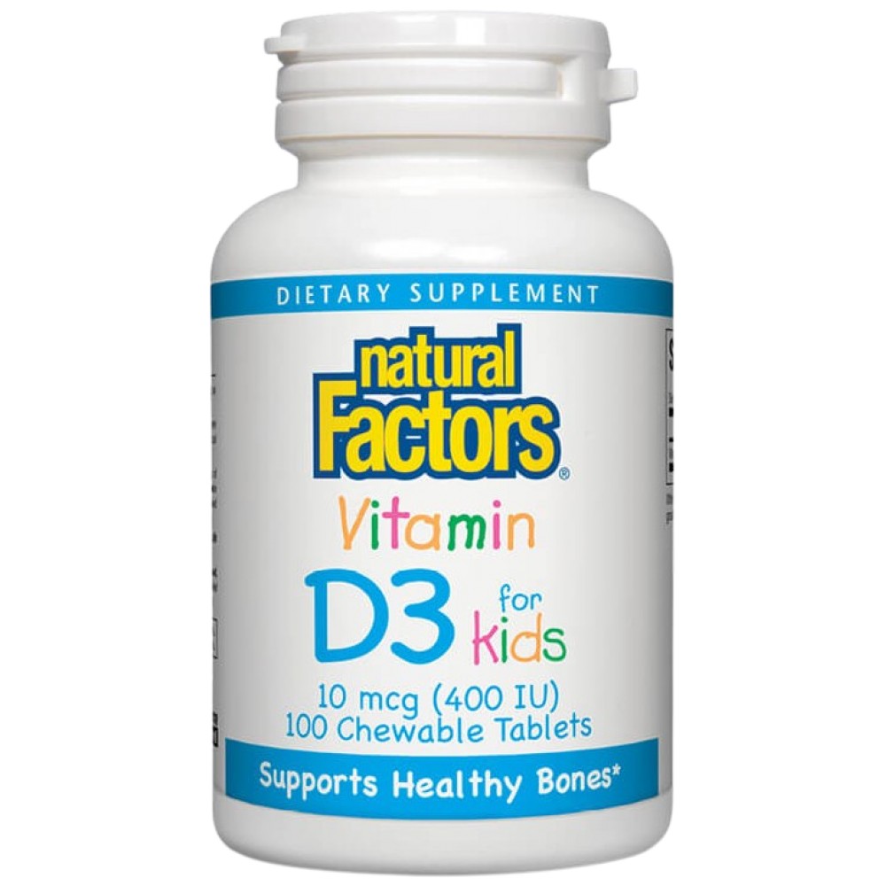 Natural Factors Vitamin D3 for Kids 400 IU е специално разработена добавка за поддръжка на здравословното развитие на костите и зъбите на децата. Този продукт идва в уникална, привлекателна за децата форма на дъвчащи таблетки с вкус на горски плодове, което прави приема на витамин Д приятен и лесен. Витамин Д3 (холекалциферол) е основен за абсорбцията на калций и фосфор в тялото, което е критично за поддържането на здрави кости и зъби, особено в детските години, когато растежът и развитието са на пик. Формулиран с внимание към детската биодостъпност и вкус, този витамин е без ГМО, без глутен, без изкуствени бои или сладкила, предлагайки родителите спокойствие за чистота и качество.