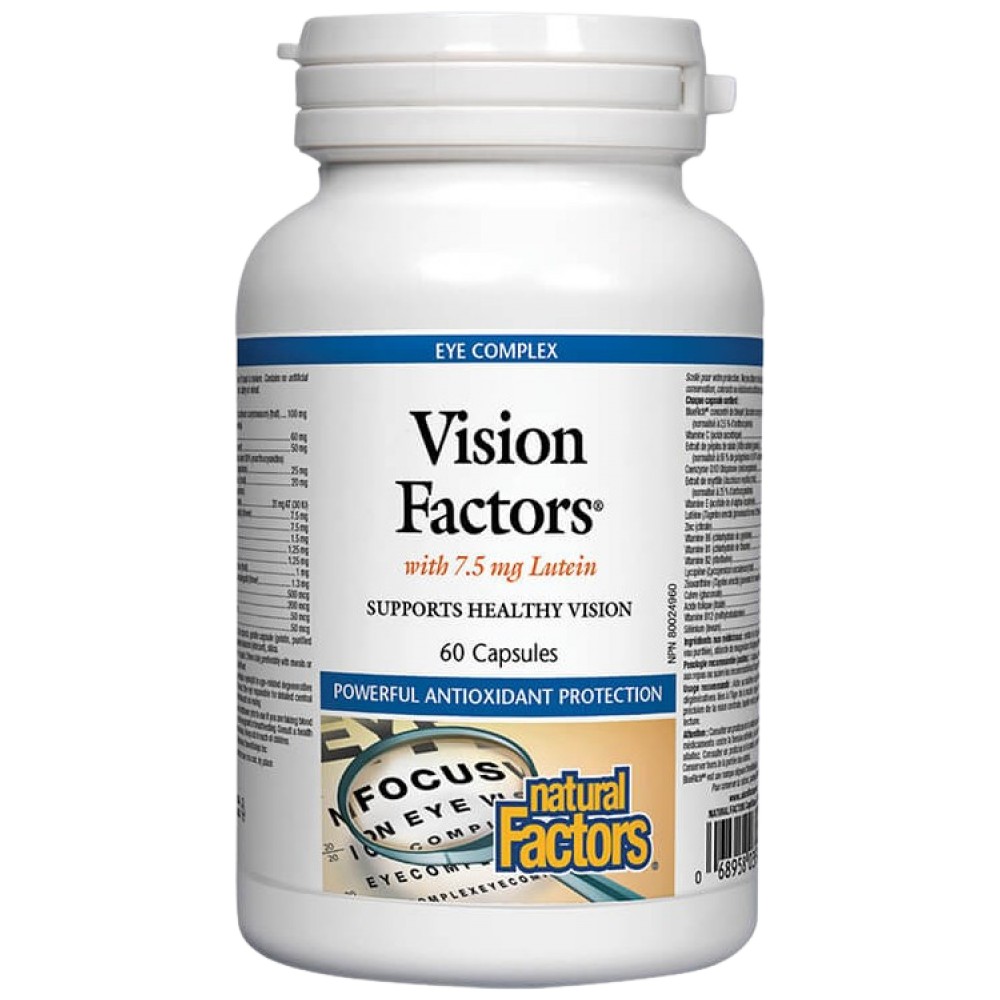 Natural Factors Vision Factors е прецизно разработена хранителна добавка, насочена към поддържането и подобряването на зрението. Този продукт съчетава в себе си мощни антиоксиданти, витамини и минерали, специално подбрани за здравето на очите. Съставен е от лутеин, зеаксантин, витамин А, витамин Е, цинк и билкови екстракти като очна трева и билката Bilberry, известни със своите бенефити за зрението. Формулиран в капсули, Vision Factors е удобен за ежедневна употреба, за да промотира дългосрочно здраве на очите, защита от оксидативен стрес и поддръжка на зрителната функция при интензивна работа пред екрани или с нарастваща възраст.