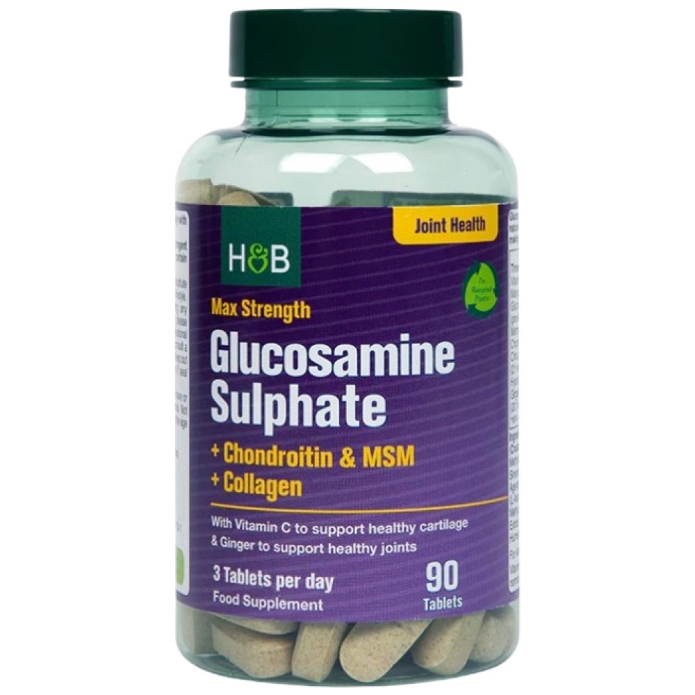 Holland & Barrett Max Strength Glucosamine Sulphate | Plus Chondroitin, MSM and Collagen поддържат здрави хрущяли и джинджифил за поддържане на здрави стави. Глюкозаминът е градивен елемент на хрущяла и ставната тъкан, приемането на тези добавки може да подпомогне производството на хрущял и да поддържа ставите ви.