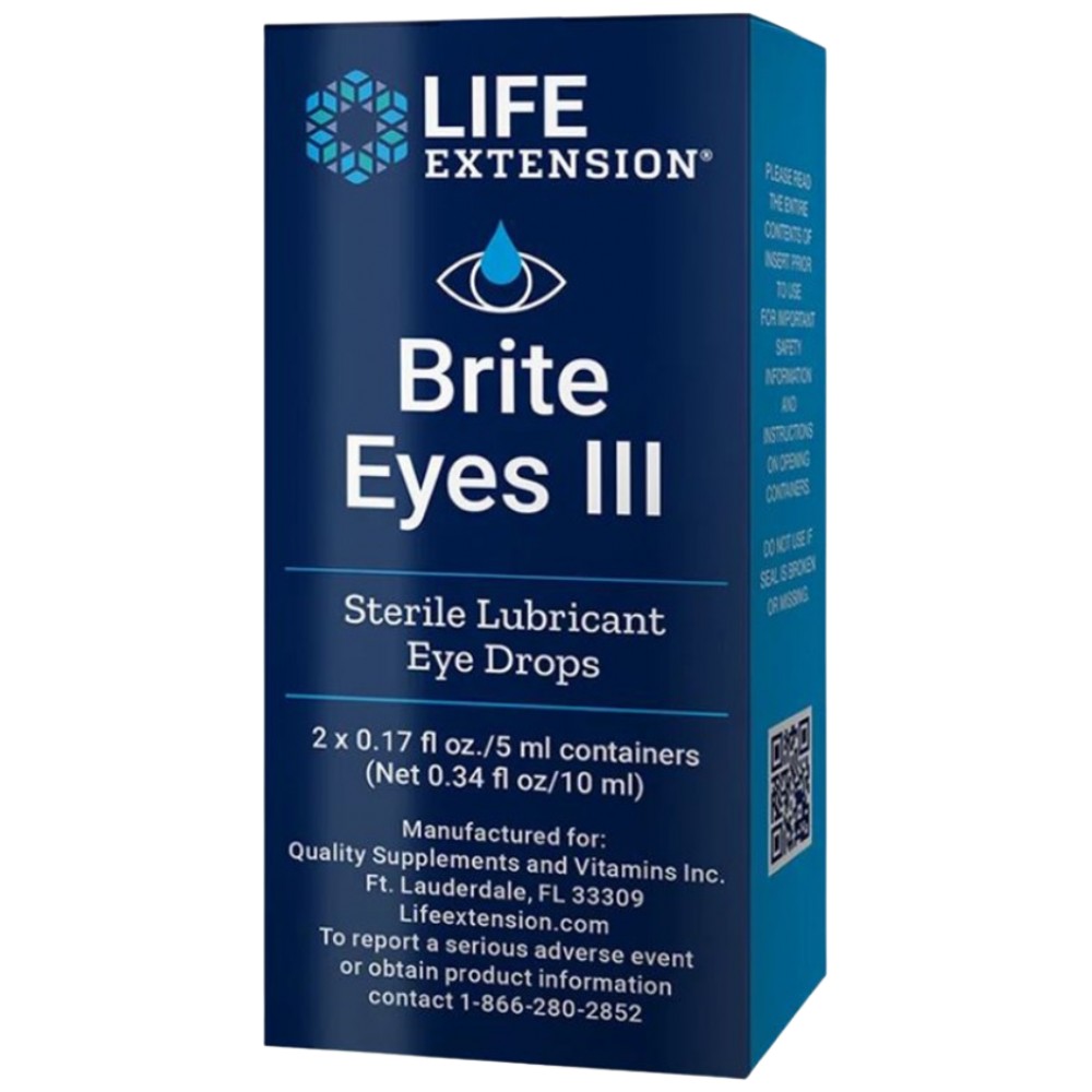 Brite Eyes III е стерилен овлажняващ разтвор за сухи и раздразнени очи на американската компания Life Extension. Капките са специално разработени с цел осигуряването на дълготрайна хидратация и защита на зрителните органи.