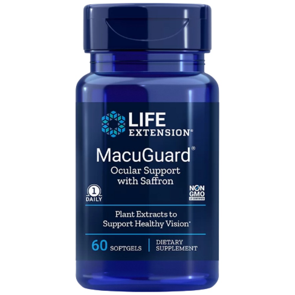 MacuGuard® Ocular Support with Saffron осигурява важни хранителни вещества, които помагат за защитата на деликатните фоторецепторни клетки на окото, насърчават здравето на макулата и ретината и помагат за поддържането на зрителната острота през нощта.