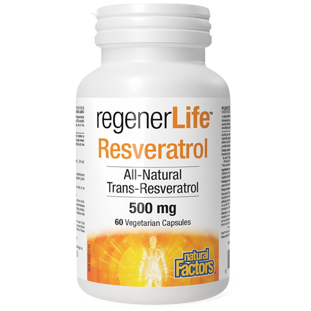 Natural Factors Regener Life Resveratrol 500 mg е премиум антиоксидантна добавка, разработена за поддръжка на здравословното стареене и оптималното здраве на сърцето. Този продукт съдържа 500 мг натурален транс-ресвератрол на капсула, извлечен от грозде и корена на японска фалопия, които са известни с високата си концентрация на този мощен антиоксидант. Ресвератролът се отличава с висока абсорбция и биодостъпност благодарение на патентованата технология на Natural Factors, което го прави идеален за поддръжка на митохондриалното здраве и защита на клетките от оксидативно увреждане. Формулиран в удобни за употреба вегетариански капсули, Regener Life Resveratrol предлага ежедневна подкрепа за тези, които ценят своята дълготрайна младост и здравословие на сърцето.