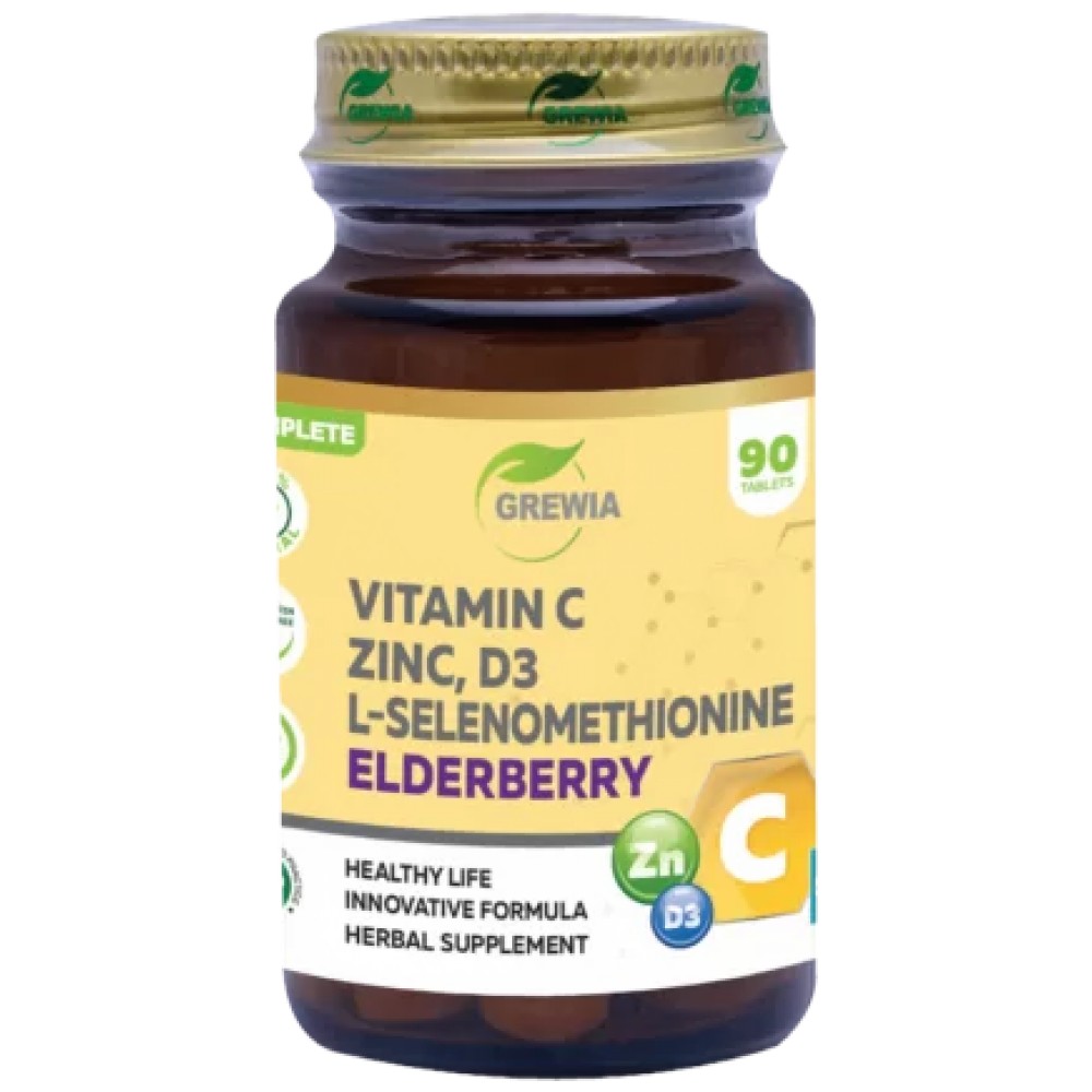 ВИТАМИН С – ЦИНК – ВИТАМИН Д3 – Л – СЕЛЕНМЕТИОНИН – ЧЕРЕН БЪЗ е продукт с марката Grewia. Той представлява хранителна добавка във вид на таблетки , в чиято 100% иновативна и ефективна формула, в състав от високо стандартизираните витамини, минерали и екстракти от Аскорбинова киселина – Витамин С /99% Ascorbic acid/, Цинк /Zinc gluconate 97.0-102.0%/, Витамин D3 /Cholecalciferol 90%/, Селен /L-Selenomethionine –Se 0.5%/ и Черен бъз/Sambucus nigra-80%/ с основната цел, да благоприятстват и укрепят цялостно вашия организъм. Ползите от приема на тази комбинация са наистина много, като някои от най-важните са: – отличен имуностимулатор и силен антиоксидант, силни противовъзпалителни, антибактериални и противогрипни свойства – Подобрява работа на мускулните органите – подпомага здравето на сърцето, белите дробове, мозъка и черния дроб, предпазва от сърдечно-съдови заболявания, – подкрепя здравето на кожата, косата и ноктите, забавя стареенето.