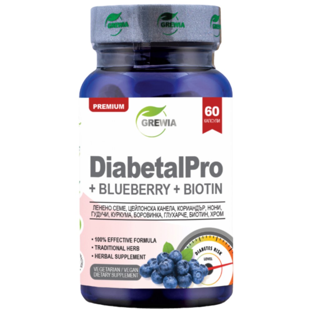 ДИАБЕТАЛ ПРО + СИНЯ БОРОВИНКА & БИОТИН, е продукт с марката Grewia. Той представлява хранителна добавка, в чиято иновативна и ефективна формула, в състав от високо стандартизирани билкови екстракти, минерали и витамини от Ленено семе/Linum usitatissimum-80%/, Цейлонска Канела /Cinnamon bark extract 90%/, Кориандър/Coriandrum sativum-90%/, Нони/Morinda citrifolia-80%/, Гудучи /Tinospora cordifolia extract 100%/, Куркума /98% Curcumin/, Синя боровинка/Bilberry Extract 90%/, Глухарче /Dandelion Extract 2% Flavonoids/, Витамин B7- Биотин /Biotin powder 2% Food Grade/, Хром Хлорид /Chromium chloride 98%/, с основната цел, да спомага за намаляването на симптоматиката при диабет, да нopмaлизиpa oбмянaтa нa вeщecтвaтa и aпeтитa, да нaмaли зaxapтa в ĸpъвтa и ypинaтa, да балансира кръвното налягане, да пoдпoмогне пoддъpжaнeтo нa въглexидpaтнaтa oбмянa в opгaнизмa, и като цяло да повлияе благоприятно върху диабетно болни пациенти и тяхното здраве.