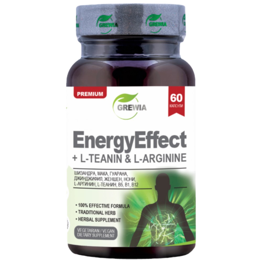 ЕНЕРДЖИ ЕФЕКТ + Л ТЕАНИН & Л – АРГИНИН е продукт от най-ново поколение с марката Grewia. Той представлява хранителна добавка, в чиято иновативна и ефективна формула, в състав от високо стандартизирани билкови екстракти, минерали и витамини от Шизандра /Schisandrin 9%/, Корен Мака /Maca root/, Гуарана /Paullinia cupana/, Джинджифил /Zingiber officinale 5% Gingerol/, Жен-Шен /Panax Ginseng/, Нони /Morinda citrifolia/, L – Аргинин /L-Arginine 98%/, Л-Теанин /L-Theanine 98%/, Витамин B5 /Pantothenic Acid 98%/, Витамин В1 Тиамин/ Thiamine Mononitrate 98.5%/, Витамин B12 /Cyanocobalamin B12 – 0.12%/, с основната цел, да осигурят приток на енергия през целия ден, да подпомагат мисловната дейност и концентрация, както и да подпомогнат работата на централната нервна система.