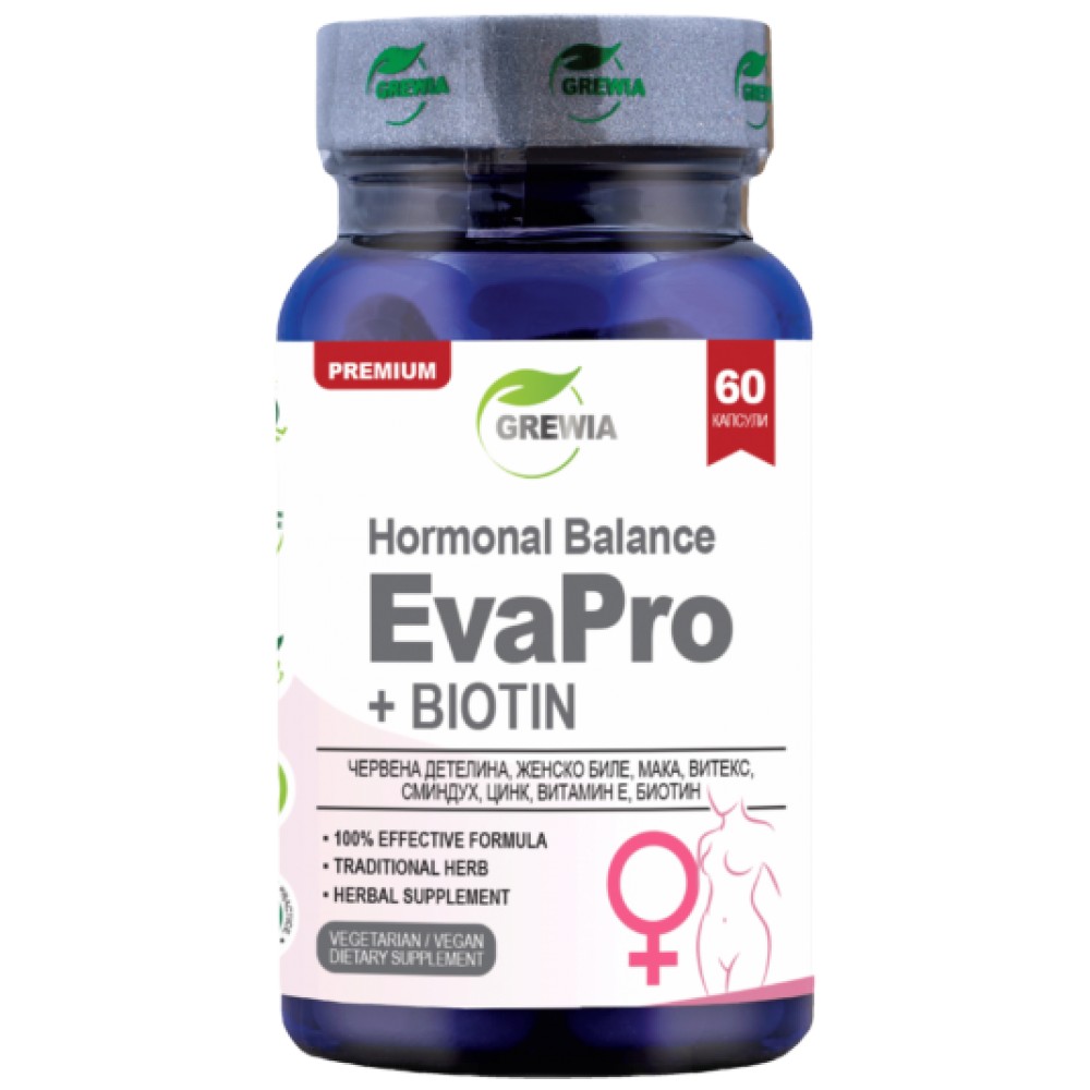 Хормонал Баланс ЕваПро + Биотин е продукт с марката Grewia, представляващ хранителна добавка в растителни/веган/ капсули, в чиято 100% иновативна и ефективна формула, в състав от високо стандартизирани билкови екстракти, минерали и витамини от Червена детелина /Red Clover extract/, Женско Биле /Glycyrrhiza glabra 3% glabridin/, Корен Мака /Maca root/, Витекс /Caste Berry Extract/, Чимен / Сминдух /Fenugreek Seed еxtract/, Цинк /Zinc gluconate 97.0-102.0%/, Витамин Е /Tокоферо̀л/, Витамин B7- Биотин /Biotin powder 2% Food Grade/, с основната цел, да регулира хормоналните нива в женския организъм, да подобри емоционалната устойчивост, да подпомогне сексуалните функции, да заздрави косата, кожата и ноктите и да ви накара да се чувствате по-здрави и жизнени.