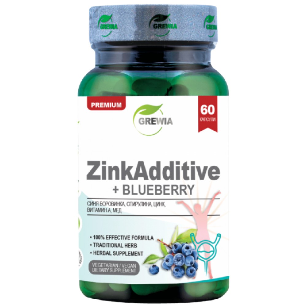 ЦИНКАДИТИВ + СИНЯ БОРОВИНКА е нов продукт с марката Grewia. Той представлява хранителна добавка в 60бр.растителни/веган/ капсули, в чиято 100% иновативна и ефективна формула, в състав от високо стандартизирани билкови екстракти, витамини и минерали от Синя Боровинка/Bilberry Extract 90%/, Спирулина/Spirulina turpin-72.15%/, Цинк /Zinc gluconate 97.0-102.0%/, Витамин А/Retinyl acetate-99%/ и Меден Глюконат/Copper gluconate-98%/ с основната цел, – да стимулира нормалната дейност на имунната система, да повлияе благоприятно на умствената и физическа дееспособност, да детоксикира, защити и укрепи организма при настъпили вече сезонни заболявания, грип или остри вирусни инфекции.
