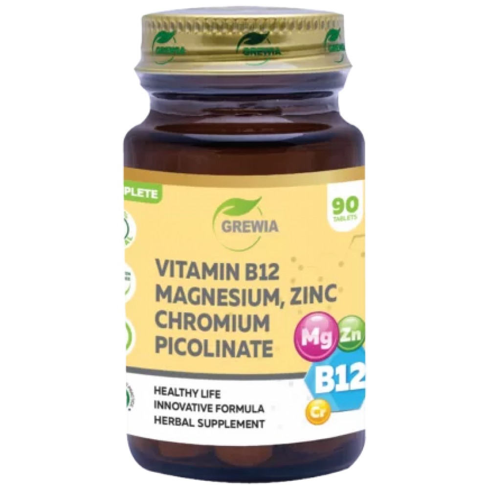 ВИТАМИН В12 – МАГНЕЗИЙ – ЦИНК – ХРОМ ПИКОЛИНАТ е продукт с марката Grewia. Той представлява хранителна добавка във вид на таблетки , в чиято 100% иновативна и ефективна формула, в състав от високо стандартизираните витамини и минерали от Магнезиев цитрат /98%-102% Magnesium Citrate/, Цинк Глюконат / Zinc Gluconate USP28 Dihydrate Powder 97.0-102.0%/, Хром Пиколинат /Chromium picolinate 90.0%/ и Витамин B12 /Cyanocobalamin B12 – 0.12%/ с основната цел, да благоприятстват и укрепят цялостно вашия организъм. Ползите от приема на тази комбинация са наистина много, като някои от най-важните са: – да допринася за поддържане на нормалното състояние на централната и периферната нервна система, енергийния метаболизъм и сърдечната функция, – да спомага за намаляването на мускулната умора и отпадналост, – да съдейства за нормалното протичане на метаболизма, – да подпомага нормалната функция на опорно-двигателния апарат.