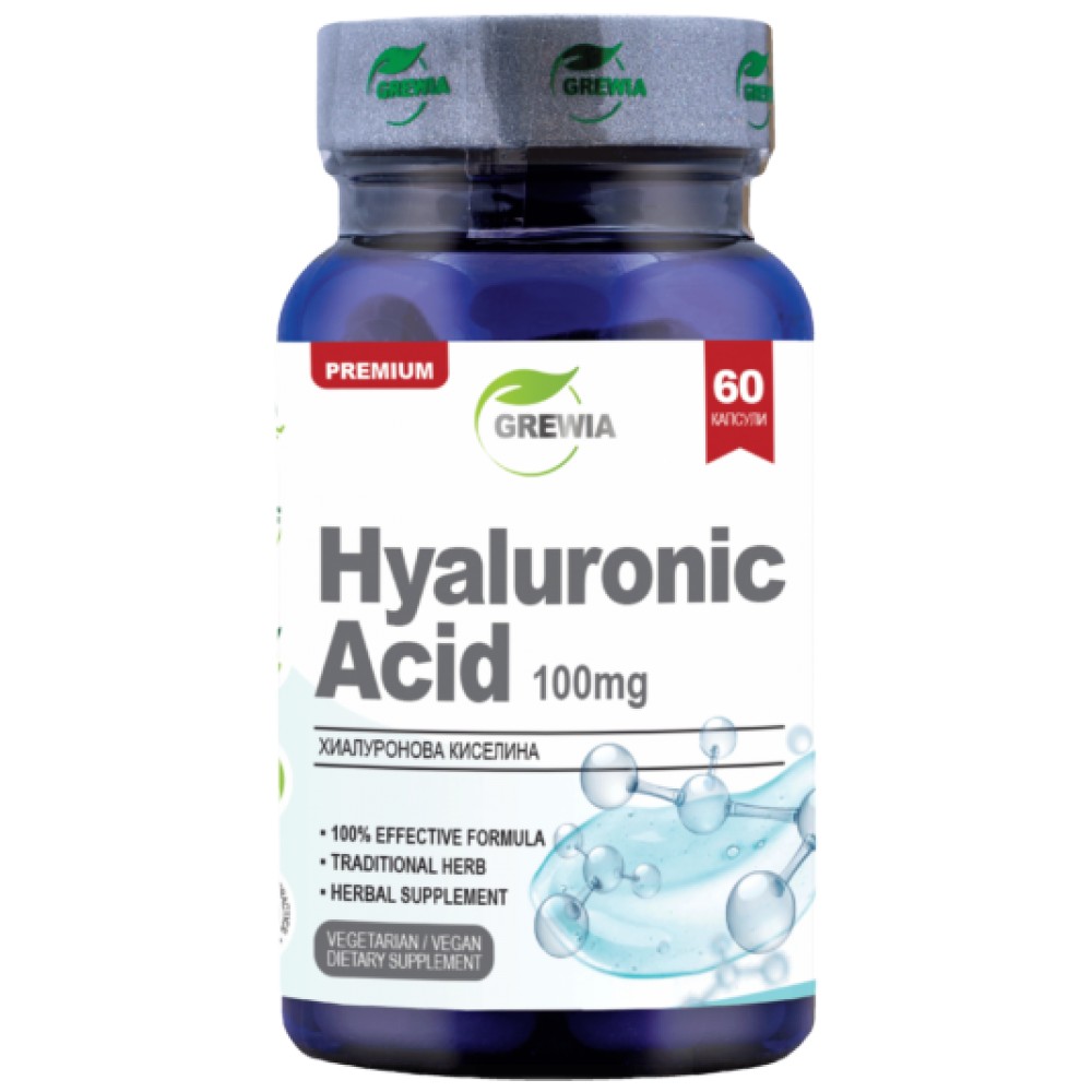ХИАЛУРОНОВА КИСЕЛИНА 100мг. е иновативен продукт с марка Grewia. Той представлява хранителна добавка, в чиято иновативна и ефективна формула, в състав от високо стандартизирана Хиалуронова киселина /Hyaluronic acid 99%/ със основната цел – да действа благоприятно върху състоянието на кожата, да поддържа водния и баланс като подобрява нейната хидратация и еластичност, да балансира гъвкавостта на ставите и хрущялите като регулира нивата на течност в синовиалната мембрана, както и да благоприятства върху структурата, здравината и бляскавостта на косата и ноктите.
