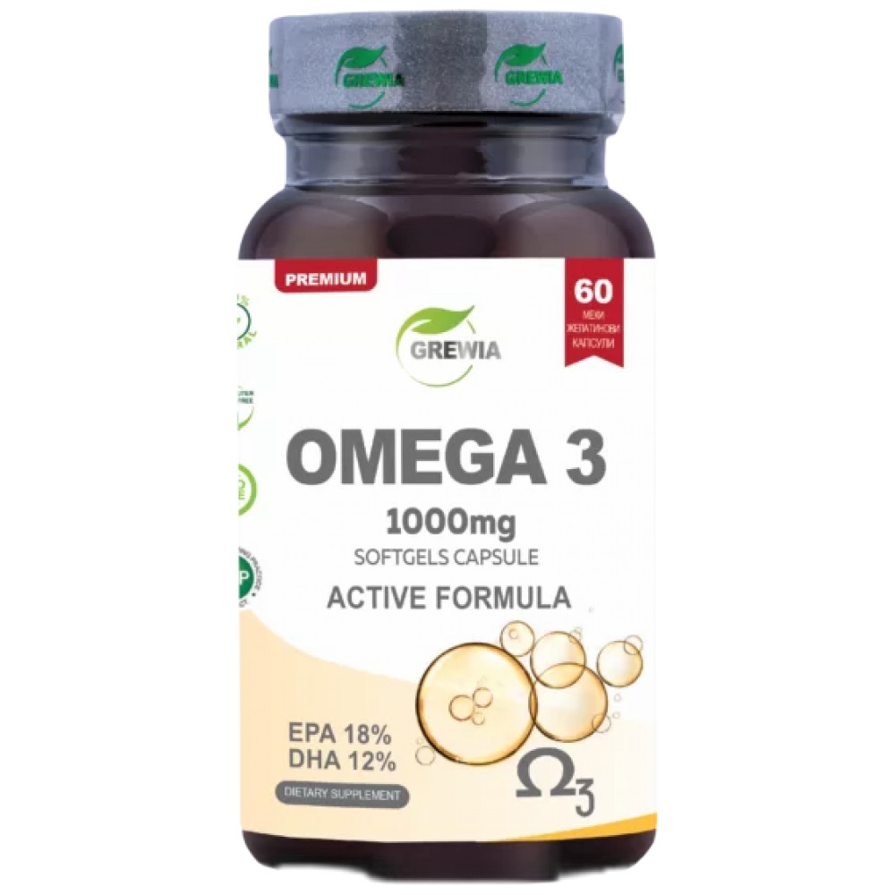 ОМЕГА 3 1000МГ – АКТИВНА ФОРМУЛА EPA:18% / DHA:12% е продукт от най-новото поколение с марката Grewia. Той представлява хранителна добавка в 60бр. меки желатинови капсули /Softgels/, в чиято 100% ефективна формула, в състав от напълно натурално рибно масло с високо съдържание на есенциалните EPA (18%) и DHA (12%) киселини, с основната цел – да подпомага нормалната функция на сърцето и мозъка, да регулира кръвното налягане, да контролира нивата на холестерола и триглицеридите в кръвта, да предпазва от появата и развитието на сърдечно-съдови заболявания, да благоприятства за доброто здраве на очите, кожата, ноктите и косата.