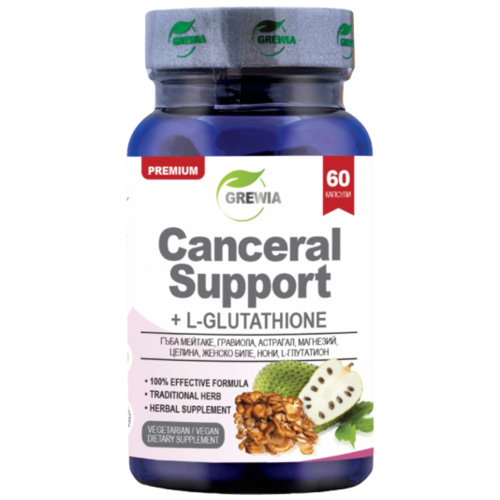 КЕНСЪРЪЛ СЪПОРТ + Л – ГЛУТАТИОН е името на топ продукта с марка Grewia. Той представлява хранителна добавка в 60бр.растителни/веган/ капсули, в чиято 100% иновативна и ефективна формула, в състав от високо стандартизирани билкови екстракти, минерали и витамини от Гъба Мейтаке/Grifola frondosa-10% polysaccharide fruiting body/, Гравиола/Annona muricata/, Астрагал/Astralagus Membranaceus-90%/, Магнезиев цитрат /98%-102% Magnesium Citrate/, Целина/Apium graveolens/, Женско Биле/Glycyrrhiza glabra-3% glabridin/, Нони/Morinda citrifolia-80%/, Л-Глутатион/L-glutathione-98.0%/, със основната цел, – да допринесат за устойчивост на вашия организъм и производството на естествени антитела в борбата с негативните последици от конвенционалните онкологични лечения и терапии – химиотерапия и лъчетерапия.