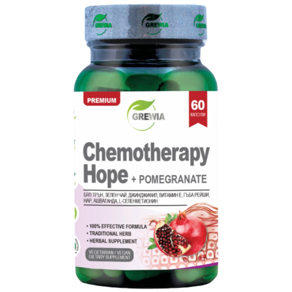 ХИМИОТЕРАПИ ХОУП + НАР е продукт от най-новото поколение с марката Grewia. Той представлява хранителна добавка в 60бр.растителни/веган/ капсули, в чиято 100% иновативна и ефективна формула, в състав от високо стандартизирани билкови екстракти, минерали и витамини от Бял трън /Silymarin-80%/, Зелен чай /Green тea еxtract-80% polyphenol/, Джинджифил /Zingiber officinale-5% Gingerol/, Витамин Е /D-алфа-токоферил ацетат/, Гъба Рейши/Ganoderma Lucidum-90%/, Нар /Punica granatum -80%/, Ашваганда /Withania somnifera-5%flavonoids/ и Селен /L-Selenomethionine-Se 0.5%/ с основната цел -да подкрепят и засилят максимално функцията на имунната система и да спомогнат възстановяването и силите на организма от негативните последици при онкологични лечения и терапии – таргетни- химио- и лъчетерапии.