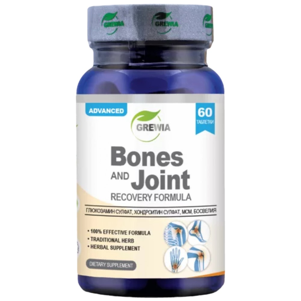 ТАБЛЕТКИ ЗА КОСТИ И СТАВИ – ФОРМУЛА ЗА ВЪЗСТАНОВЯВАНЕ е продукт от най-новото поколение с марката Grewia. Той представлява хранителна добавка в 60бр. таблетки, в чиято 100% ефективна формула, в състав от високо стандартизиран натурални екстракти и минерали от Глюкозамин сулфат /Glucosamine Sulfate/, Хондроитин сулфат /Chondroitin Sulfate /, МСМ – Метил сулфонил метан /Мethyl sulfonyl methane MSM/, Екстракт Босвелия /Boswellia carterii – от което 65% босвелиева киселина /boswellic acid / с основната цел – да благоприятства и подобрява здравината и гъвкавостта на ставите, хрущялите и сухожилията, да подпомага нормалното изграждане и възстановяване на костното вещество, да спомага за самостоятелния синтез на колагена, които е основният градивен елемент на съединителната тъкан