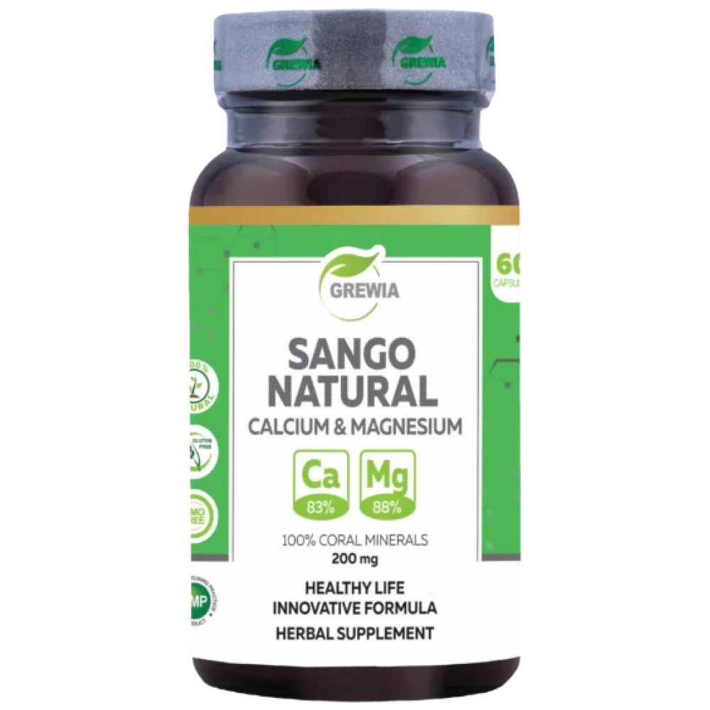 САНГО НАТУРАЛ – КАЛЦИЙ И МАГНЕЗИЙ е продукт с марката Grewia. Той представлява хранителна добавка във вид на капсули, 100% иновативна и ефективна формула, в състав от йонизирани минерали извлечени от морския Корал Sango – Япония /остров Окинава/ – Магнезий /Magnesium 88% / и Калций /Calcium 83%/