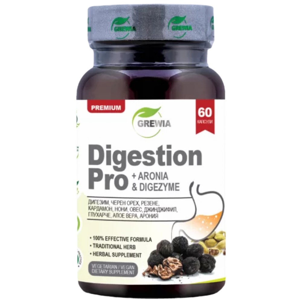 ДИГЕСТИОН ПРО + АРОНИЯ & ДИГЕЗИМ е иновативен продукт от най-ново поколение с марката Grewia. Той представлява хранителна добавка, в чиято иновативна и ефективна формула, в състав от високо стандартизирани билкови екстракти и храносмилателни ензими от Дигезим /Multienzyme complex – DigeZyme 99.87 %/, Черен орех /Black walnut extract 90%/, Резене – Див копър/Fennel Extract-80%/, Кардамон/Elettaria cardamomum/, Нони/Morinda citrifolia-80%/, Овес/Avena Sativa-90%/, Джинджифил /Zingiber officinale 5% Gingerol/, Глухарче /Dandelion Extract 2% Flavonoids/, Алое вера /Aloe vera extract 90%/ и Арония, с основната цел, да подкрепят функцията на храносмилателната система, да облекчат киселините и да намалят чувството на тежест и дискомфорт в стомаха.