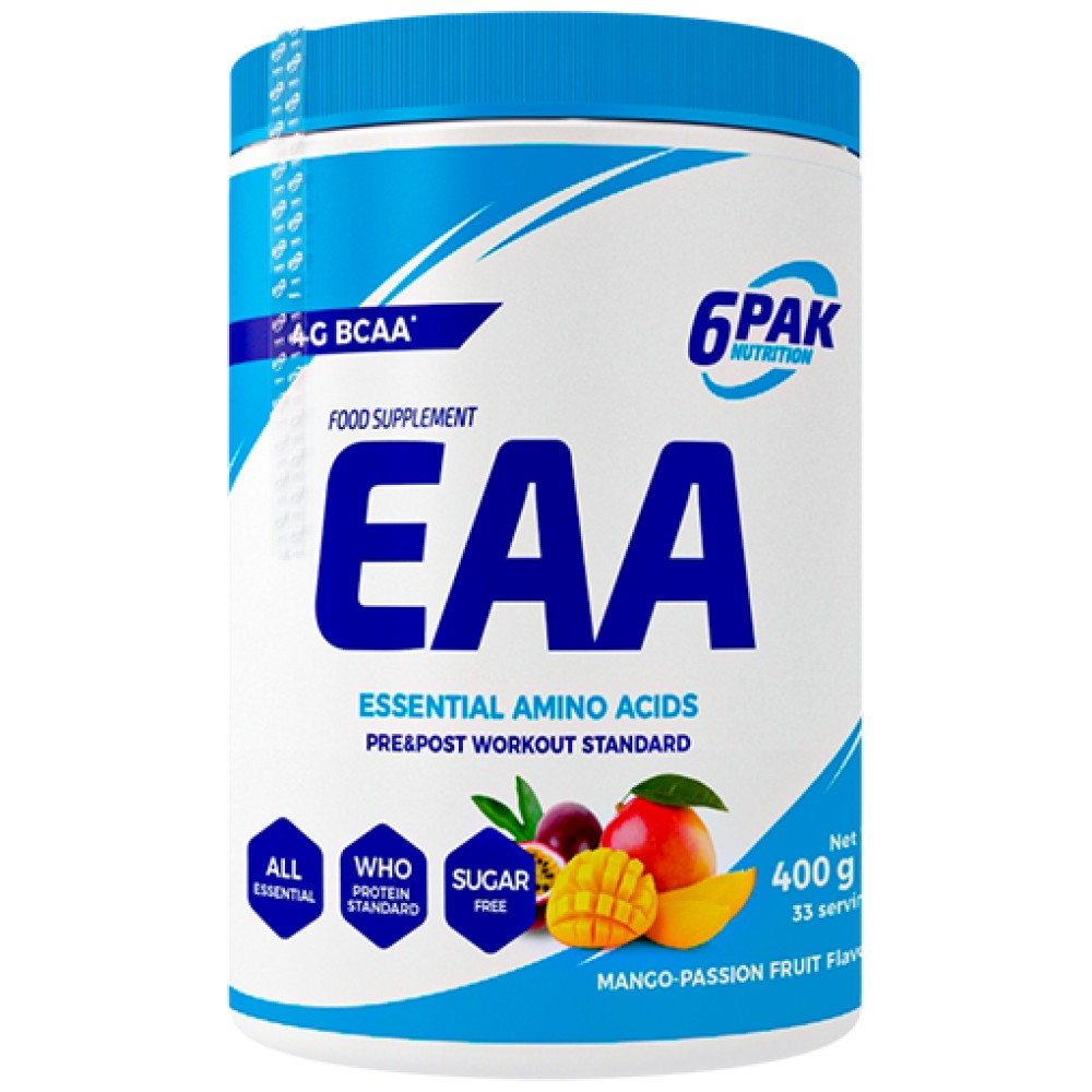 EAA на 6PAK Nutrition е хранителна добавка на прах, която съдържа есенциални аминокиселини, покриващи 100% от дневната нужда на човешкия организъм. Аминокиселините са основните градивни частици на протеините. А протеините от своя страна са основен градивен елемент на клетките.