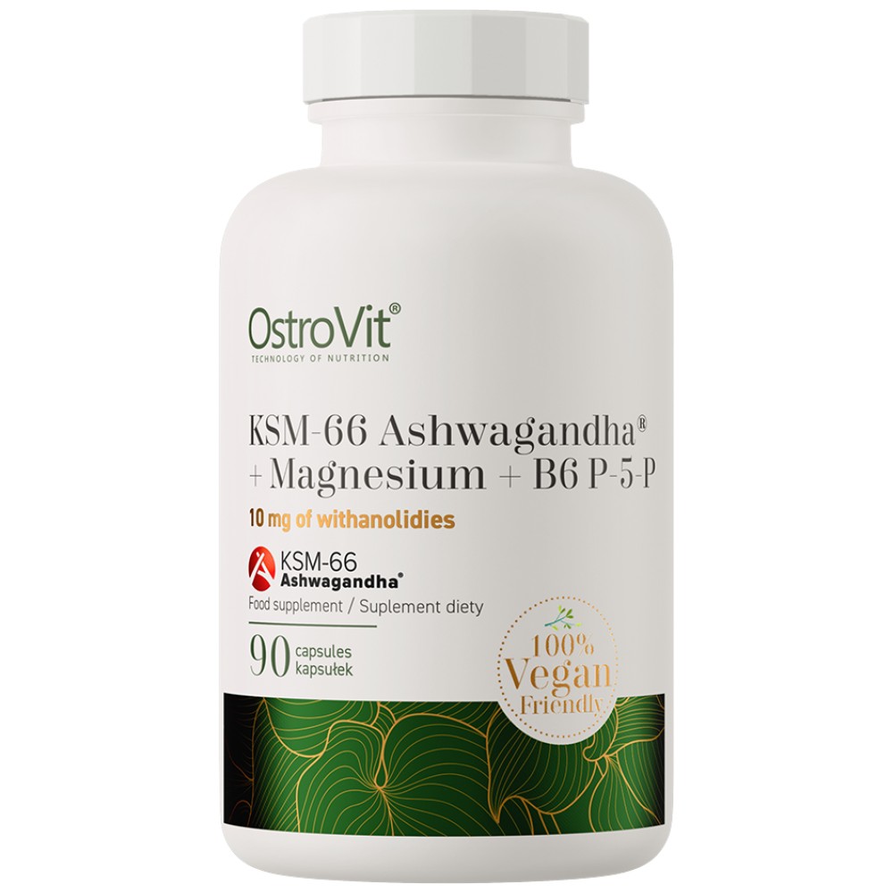OstroVit KSM-66 Ashwagandha® + Магнезий + Витамин B6 P-5-P VEGE е висококачествена хранителна добавка, съчетаваща три мощни съставки за подпомагане на нервната система, намаляване на стреса и подобряване на психическото и физическото благосъстояние. Формулата е подходяща за вегани и вегетарианци, като не съдържа съставки от животински произход.