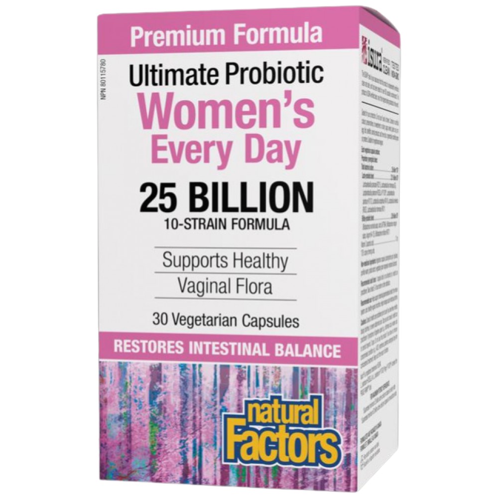 Natural Factors Women's Every Day Probiotic 25 Billion е специализиран пробиотичен продукт, разработен с мисълта за женското здраве. Този продукт съдържа 25 милиарда активни клетки, разпределени в 10 внимателно подбрани пробиотични щама, които са устойчиви на желудъчна киселина, което гарантира максимална ефективност при достигане до дебелото черво. Формулиран в капсули, Women's Every Day Probiotic е идеален за всяка жена, търсеща поддръжка за своето храносмилателно, вагинално и имунно здраве. Включва ключови пробиотици като Lactobacillus acidophilus, Bifidobacterium bifidum, и Lactobacillus rhamnosus, които са известни с тяхната способност да поддържат баланса на микробиомата и да помагат за здравословното функциониране на организма.