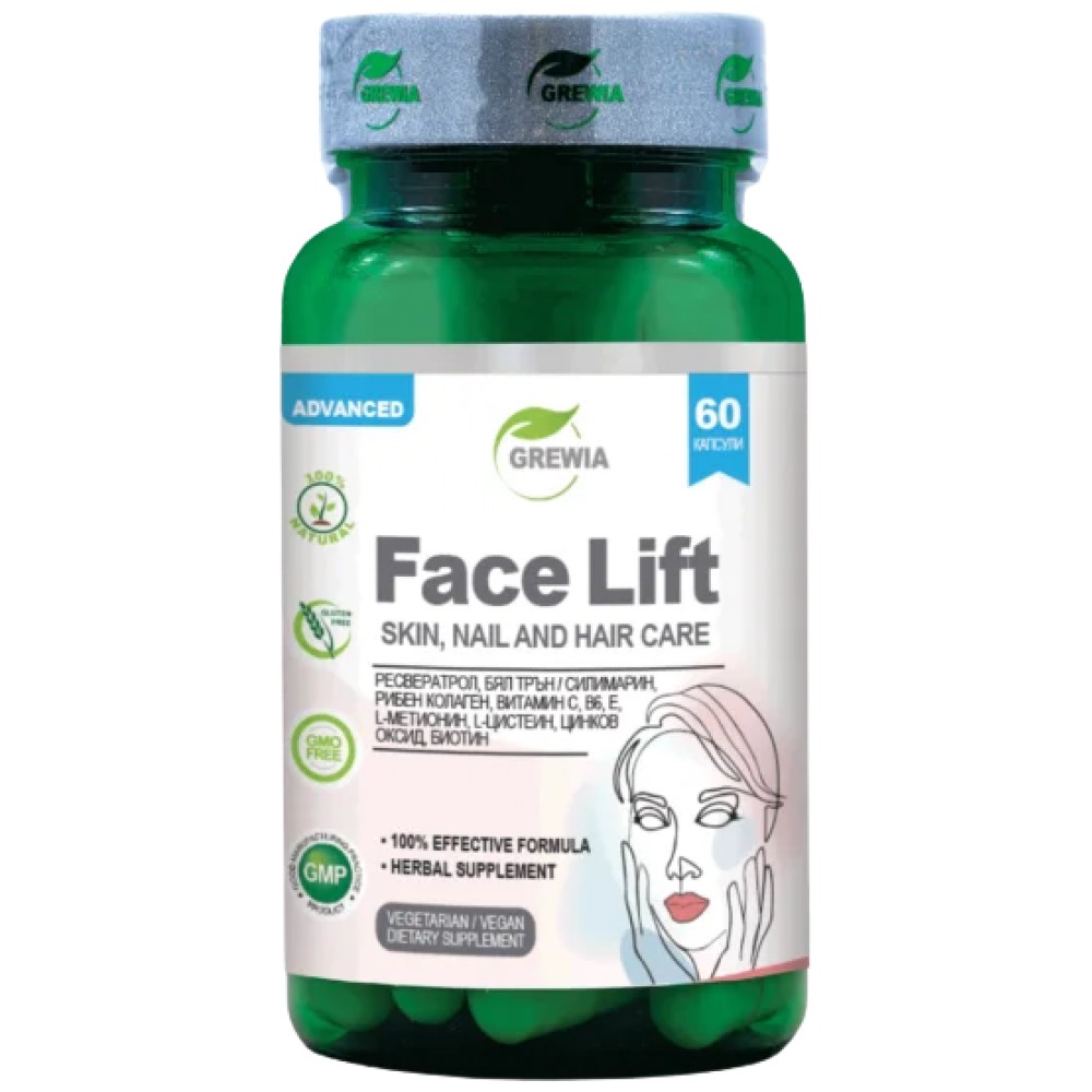ФЕЙС ЛИФТ е продукт от най-новото поколение с марката Grewia. Той представлява хранителна добавка в 60бр. желатинови капсули, в чиято 100% ефективна формула, в състав от високо стандартизирани натурални екстракти, витамини и минерали от Ресвератрол от Японска фалопия / Polygonum cuspidatum / Екстракт Бял трън / Silybum marianum – 80% силимарин /Silymarin/, Рибен колаген /Fish collagen-White flowing powder 99.2% /, Vitamin C /99% L- Ascorbic acid/, L -Метионин /L -Methionine/, L- Цистеин /L -Cysteine/, Витамин В6 /Pyridoxine Hydrochloride 99%/, Витамин Е /Vitamin E Powder 50% dl-Alpha Tocopheryl Acetat /, Цинков оксид /Zinc Oxide/ и Витамин В7 – Биотин / D-Biotin 98%/ с основната цел – да поддържа цялостната красота и благосъстояние, да спомага за насърчаване на по-здрава коса, по-силни нокти и сияйна кожа, за намаляване дълбочината на бръчките и тънките линии по лицето, да забавя естествените процеси, които съпътстват стареенето.