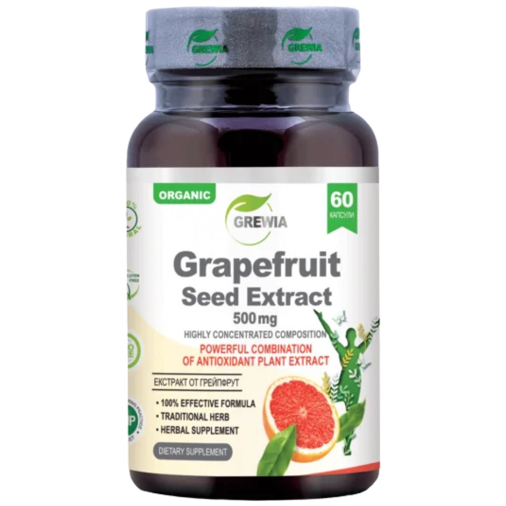 Organic Grapefruit Seed Extract 500mg. е иновативен продукт с марка Grewia. Той представлява хранителна добавка 60бр. капсули, лабораторно и клинично изпитана, в чиято иновативна и ефективна формула, в състав от високо стандартизиран органичен и пречистен екстракт от Грейпфрут /Citrus paradise 87% HPLC/ със основната цел, да осигури необходимите антиоксидантни съединения и микроелементи за клетъчното здраве и естественото насърчаване на обмена на течностите в организма в подобряването на хормоналния баланс и редуцирането на мазнините в тялото, да спомага и укрепва здравето на сърдечно-съдовата и кръвоносната система