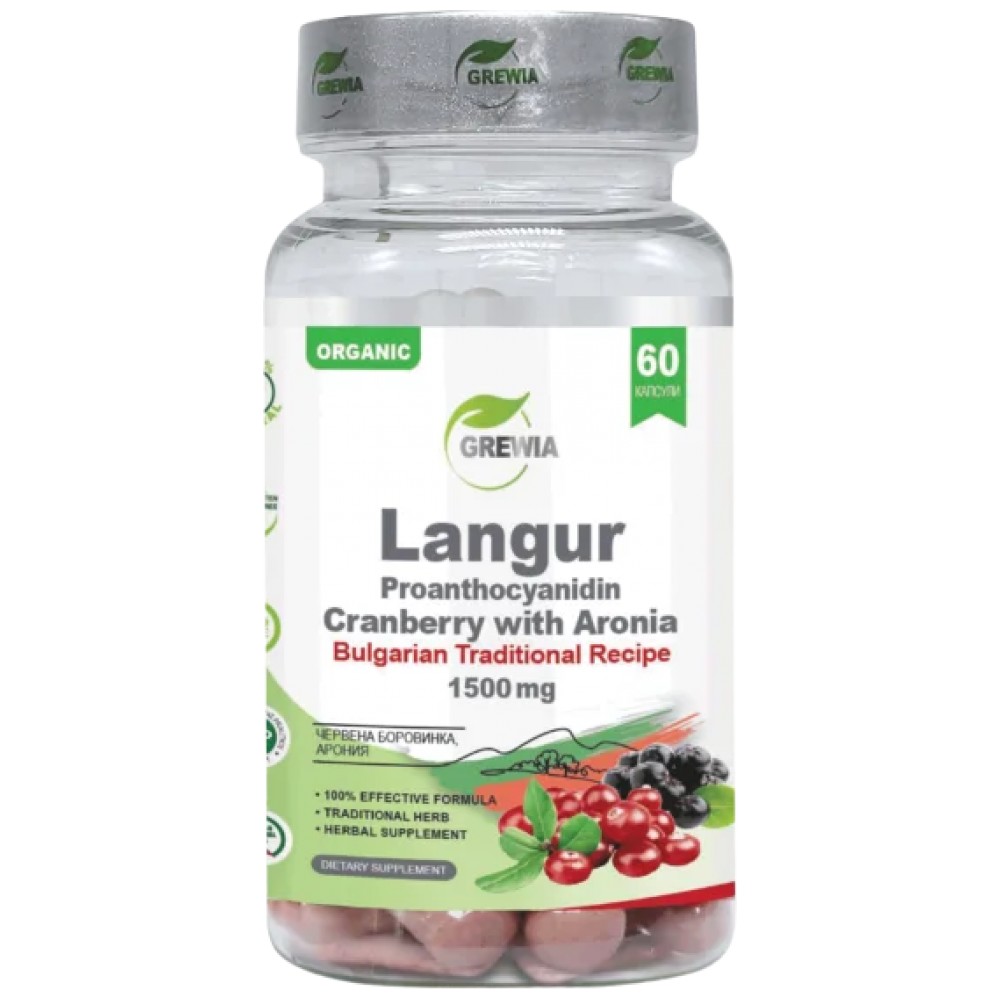 ЛАНГЮР – ПРОАНТОЦИАНИДИН /Червена Боровинка с Арония 1500мг. е иновативен и традиционен Български продукт с марка Grewia. Той представлява органична и натурална хранителна добавка 60бр. капсули с максимална дневна доза, в чиято доказано мощна и ефективна формула, в състав високо стандартизирани екстракти от Червена Боровинка 50% проантоцианидини /Cranberry Extract 50% proanthocyanidins/ и Арония /Aronia melanocarpa 95% HPLC 10% Anthocyanin / с основната цел – да спомага за поддържането на доброто състояние на пикочните пътища като оказва благоприятно въздействие върху дейността на отделителната система, да намалява симптомите на интоксикация, да повлиява благоприятно храносмилателните процеси, да спомага положително дейността на сърдечно-съдовата и кръвоносната система, да благоприятства обмяната на глюкоза в организма, да поддържа добрия имунитет.