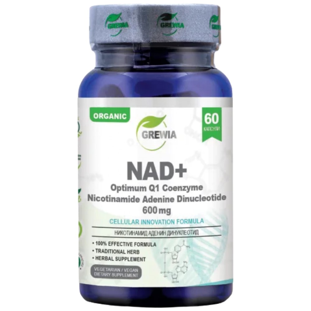 NAD+ /Q1 Nicotinamide Adenine Dinucleotide 600мг. е иновативен молекулен продукт с марка Grewia. Той представлява хранителна добавка 60бр. веган капсули, с удължено освобождаване, в чиято ефективна формула, в състав от β/Бета Никотинамид рибозид хлорид / Nicotinamide riboside chloride /- молекулна форма на витамин В3 като Никотинамид аденин динуклеотид / NADH nicotinamide adenine dinucleotide / със основната цел, да увеличи нивата на NAD+ в клетките, което играе решаваща роля в редица биологични процеси в клетъчния метаболизъм, да забавя признаците на стареене на клетъчно ниво, да засилва митохондрялната биогенеза, да допринася за насърчаване здравето и благосъстоянието, като подпомага енергийния метаболизъм и клетъчния имунитет.