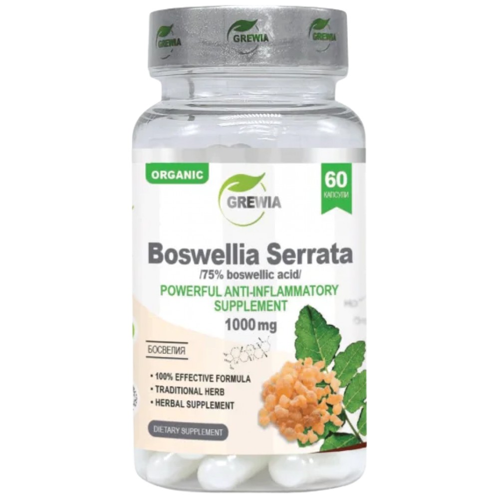 Boswellia Serrata 1000mg. е иновативен продукт с марка Grewia. Той представлява хранителна добавка 60бр. капсули, в чиято иновативна и ефективна формула, в състав от високо стандартизиран и пречистен билков екстракт от Босвелия /Boswellia serrata 75% boswellic acid/ – съдържание на 75% босвелиева киселина, със основната цел, да влияе положително върху опорно-двигателната система, да подобрява гъвкавостта на ставите и хрущялите, да предпазва съединителната тъкан, намалява възпалението и скованост в ставите, да облекчава болките в мускулите и подобрява подвижността, да оказва блaгoпpиятeн eфeĸт въpxy дихателната система, да подобрява състоянието на косата, кожата и ноктите, да подпомага нормалната дейност на имунната система и защитните сили на организма като оказва силно противовъзпалително действие.