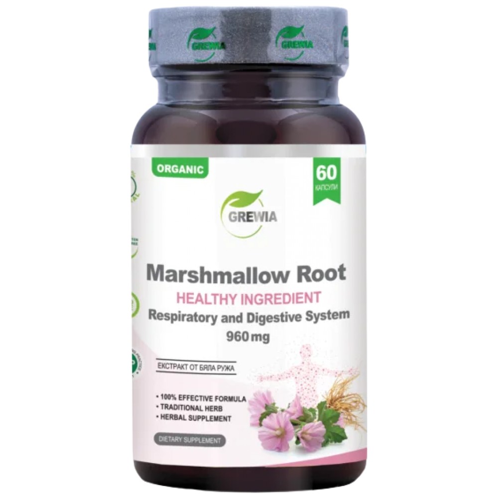 Marshmallow Root 960mg. е иновативен продукт с марка Grewia. Той представлява хранителна добавка 60бр. капсули, в чиято иновативна и ефективна формула, в състав от високо стандартизиран и пречистен билков екстракт от корен на Бяла ружа /Althaea officinalis L 99% HPLC/, със основната цел, да подпомага нормалната дейност на имунната система и защитните сили на организма, да допринася за нормалното функциониране на дихателната система и бронхите, да насърчава на производството на урина и изхвърляне на токсините от тялото особено полезно при хора с инфекции на пикочните пътища или предразположени към задържане на вода, да подпомага дейността на стомаха, лигавицата и храносмилателната система, да балансира нормите на кръвната захар и лошия LDL холестерол. Да оказва благоприятен ефект върху естествените антиоксидантни, противовъзпалителни и противовирусни процеси в организма.