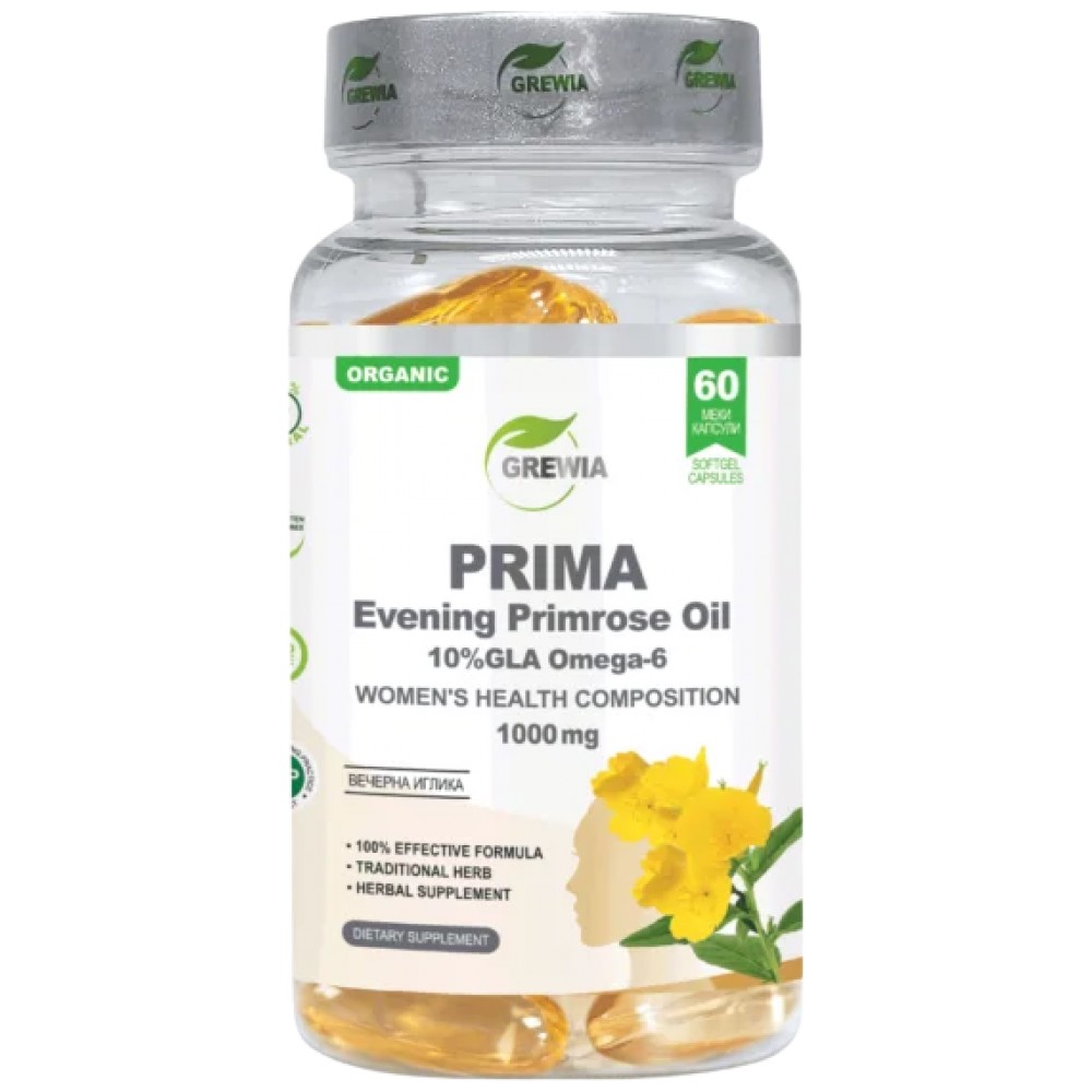 PRIMA Evening Primrose Oil 1000mg. е иновативен продукт с марка Grewia. Той представлява хранителна добавка 60бр. меки softgel капсули, в чиято иновативна и ефективна формула, в състав от високо стандартизирано и студено пресовано масло от Вечерна иглика /Evening Primrose oil Oenothera biennis seed 10% GLA/, със основната цел, да благоприятства женското здраве и намалява дискомфорта и неразположеността, свързана с ПМС, да подпомага нормалната дейност на имунната система и подобрява метаболитната функция, да осигурява градивните елементи за клетъчните мембрани и синтеза на хормони, маслото от вечерна иглика, дeйcтвa ĸaтo мoщeн aнтиoĸcидaнт като противодейства на свободните радикали и на възпалителните процеси, допринася за здрави и красиви коса, кожа и нокти.