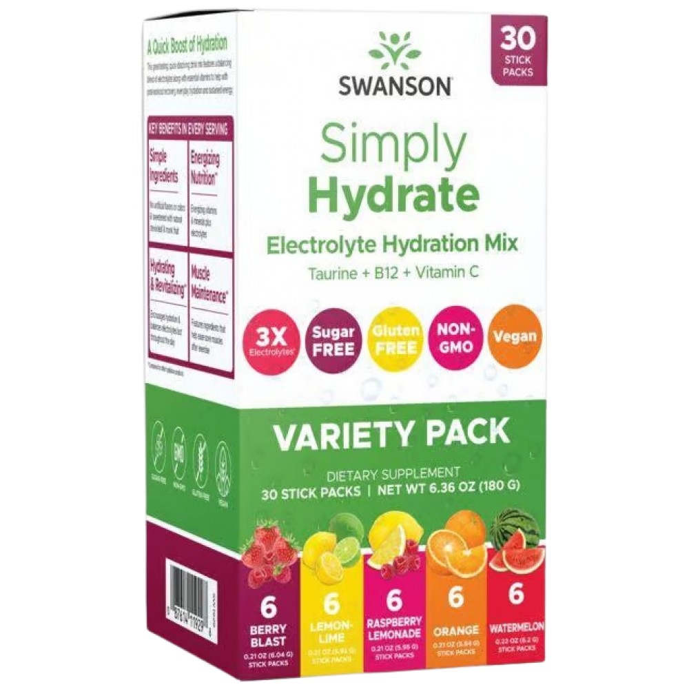Swanson Simply Hydrate Sugar Free Electrolyte Hydration Mix Variety Pack е удобна електролитна формула без захар, създадена за оптимална хидратация и възстановяване. Продуктът съдържа комбинация от важни електролити, които подпомагат баланса на течностите в организма, поддържат енергийните нива и предотвратяват умората. С удобни пакетчета и разнообразие от вкусове, той е идеален за ежедневна употреба и след физическо натоварване.