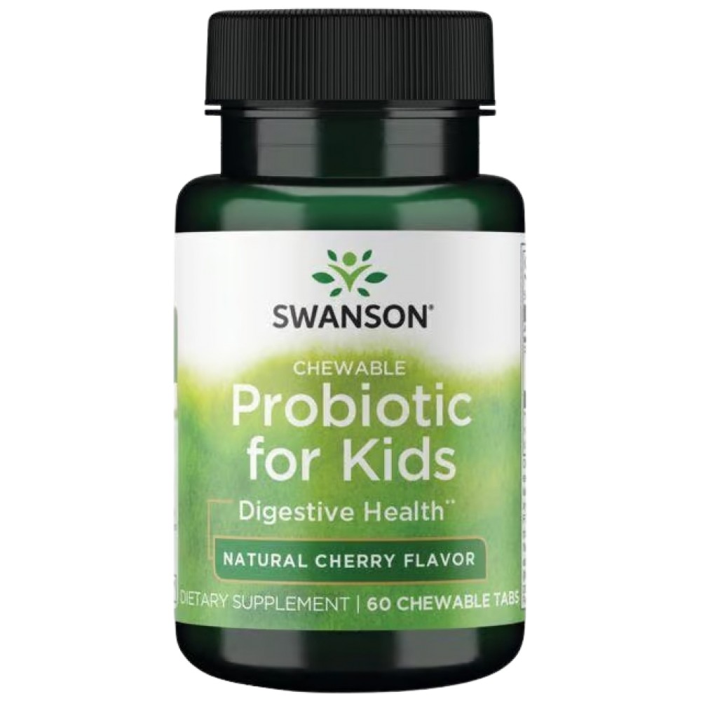 Swanson Chewable Probiotic for Kids Natural Cherry Flavor е дъвчаща пробиотична добавка за деца с естествен вкус на череша. Формулата съдържа полезни пробиотични щамове, които подпомагат здравето на храносмилателната система, баланса на чревната флора и имунитета. Приятният вкус прави приема лесен и приятен за децата, като същевременно осигурява ежедневна подкрепа за тяхното здраве.