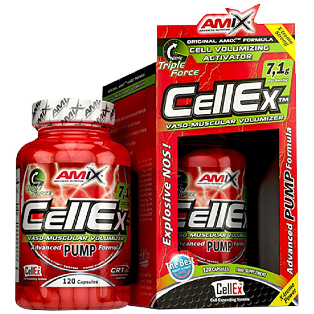 Всяка капсула Amix CellEx съдържа смес от CellEx CVA (Активатор на клетъчното увеличаване), CellEx Nitric Tripple Force Complex и L-Citruline Malate, за да гарантора страхотни помпи (мускулно уголемяване), по-добро сърдечносъдово състояние и по-бързо възстановяване след треноровки. Methocel CRT-ss (Подпомагаща система за технологията за контролирано освобождаване) осигурява продължително снабдяване на мускулната тъкан с важни нутриенти в продължение на целия ден.