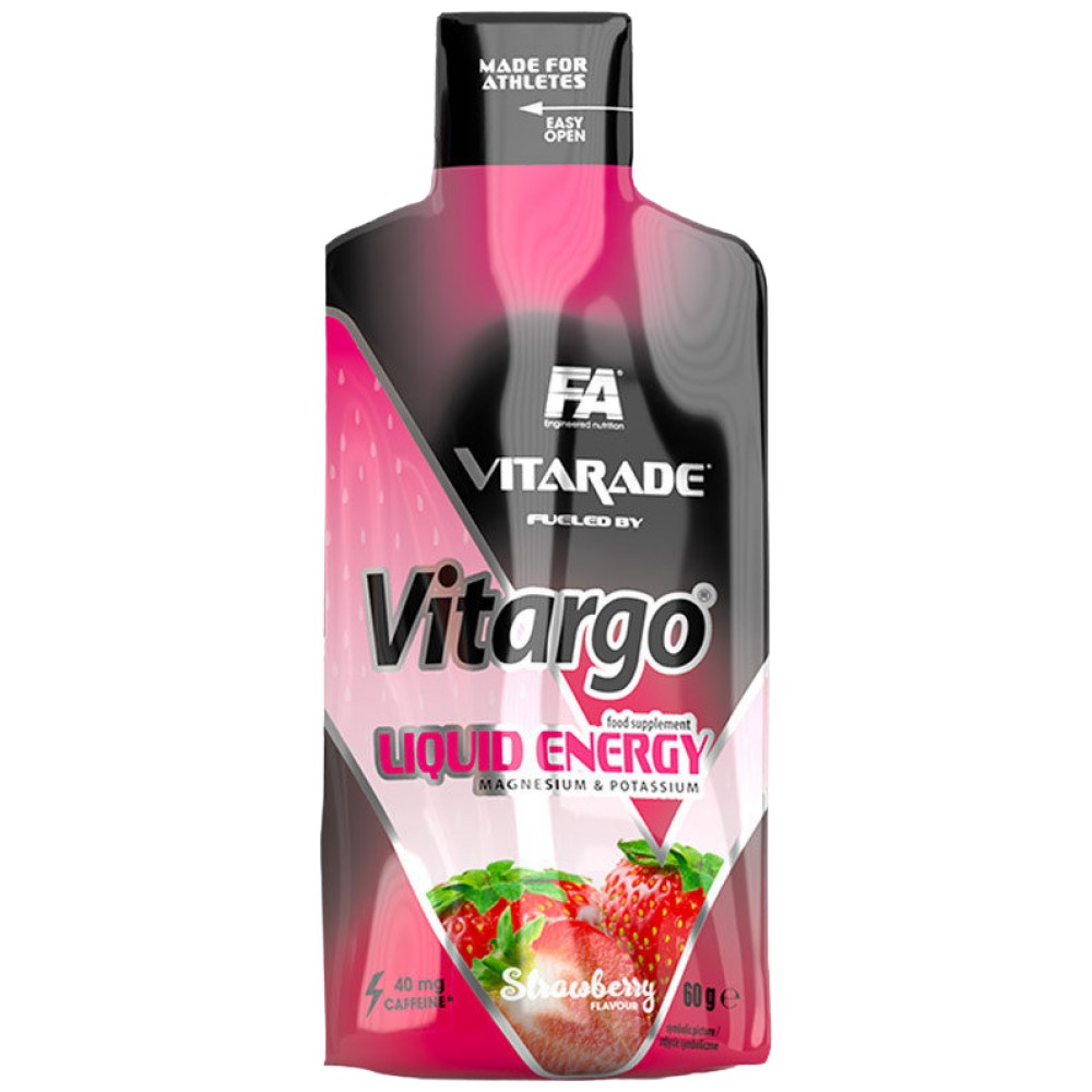 Vitargo® Liquid Energy. Хранителна добавка. Въглехидратен енергиен гел, предназначен за здрави, физически активни възрастни. Съдържа кофеин. Не се препоръчва за деца, бременни или кърмачки (40 mg/1 саше; 161 mg/дневна порция).Състав: Вода, малтодекстрин, фруктоза, царевично нишесте (Vitargo®) 7,8%, кофеин, калиев цитрат, магнезиеви соли на лимонена киселина, регулатор на киселинността (ябълчена киселина), консерванти (калиев сорбат, нат...