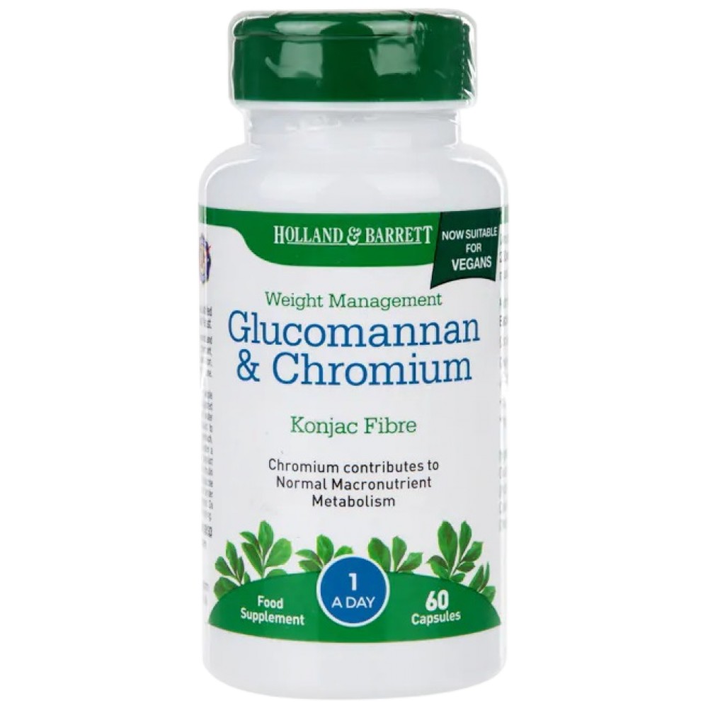 Holland & Barrett Glucomannan & Chromium са богати на фибри коняк. Konjac Fiber почти няма калории, но има много високо съдържание на фибри. При контакт с вода глюкомананът се разширява и може да абсорбира до 50 пъти теглото си. Следователно препоръчителната доза глюкоманан е по-ниска в сравнение с други добавки с фибри. Хромът подпомага поддържането на нормални концентрации на глюкоза в кръвта и допринася за нормалния метаболизъм на макронутриенти (мазнини, протеини и въглехидрати). Подходящо за вегани.