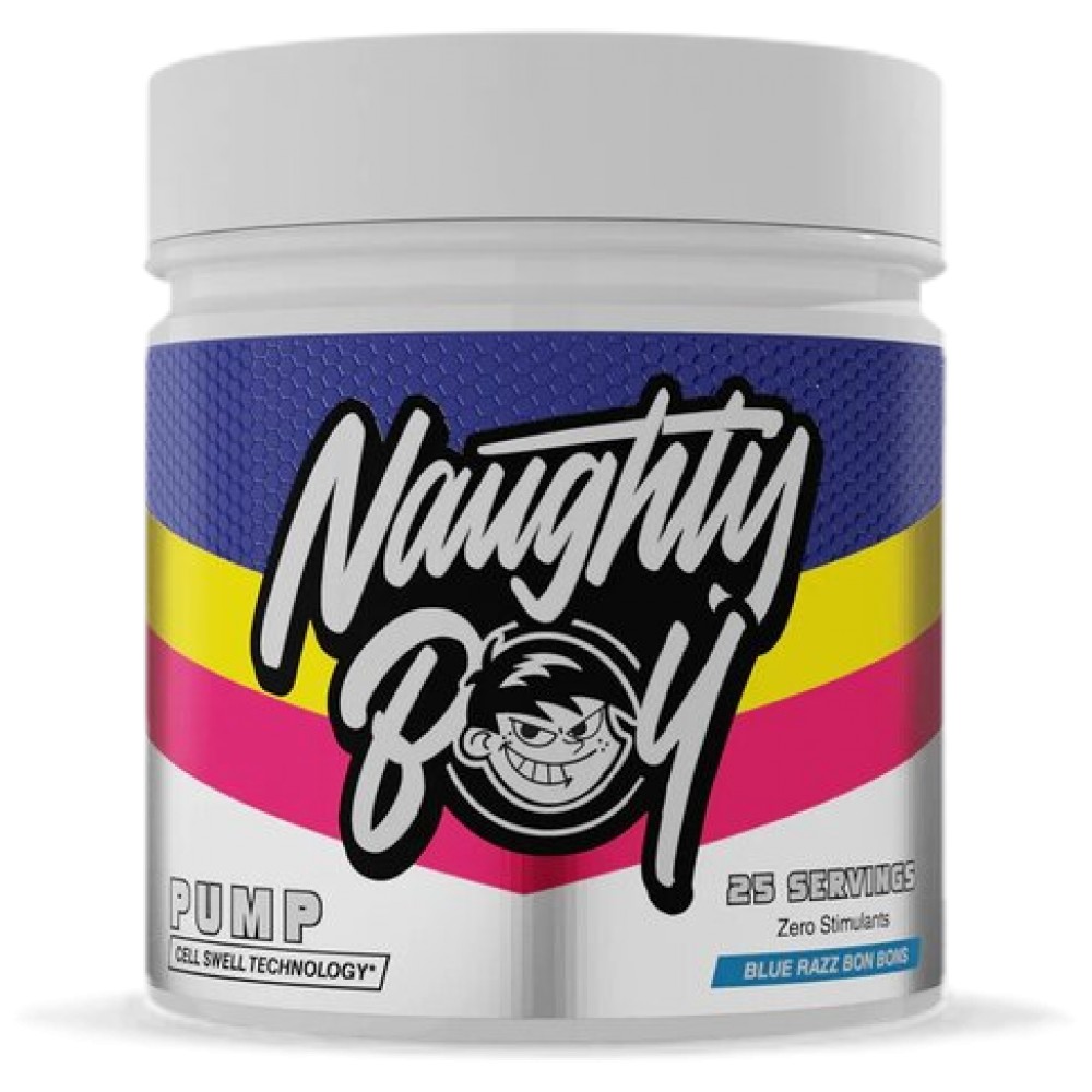 NaughtyBoy® PUMP е напълно прозрачен, не съдържа НУЛА стимуланти и НУЛА забранени вещества. NaughtyBoy® PUMP се предлага в три вкусни вкуса: Pineapple Crush, Blue Razz Bon Bons и Tropical Punch.