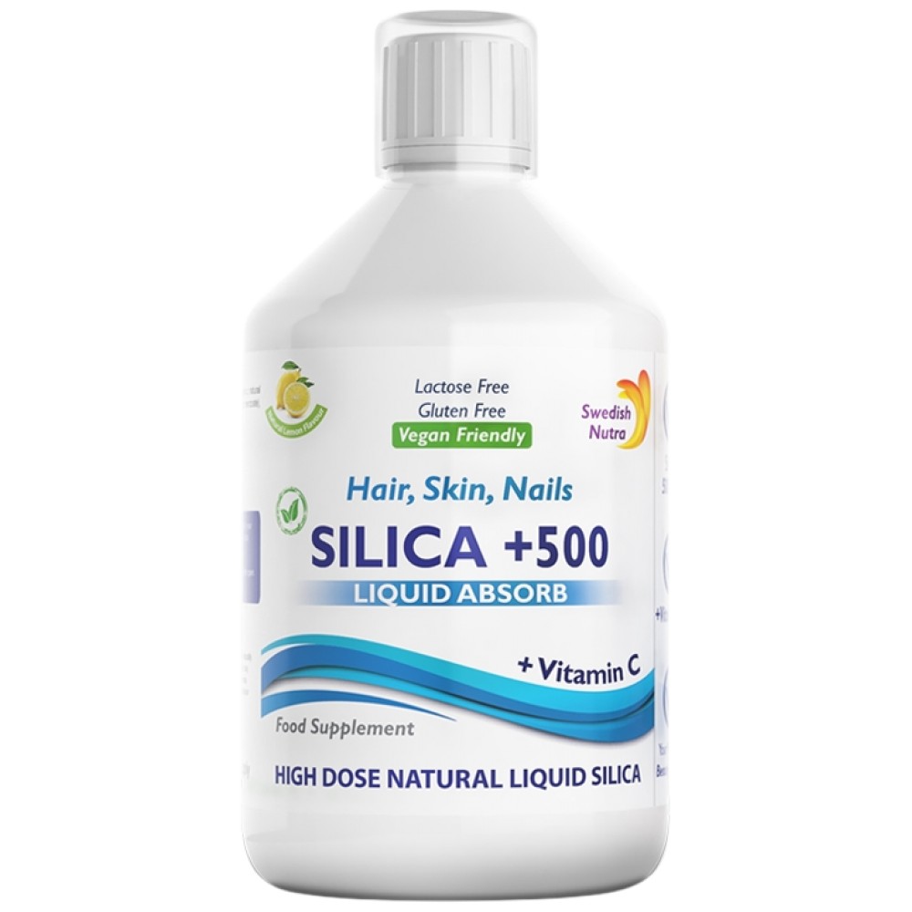 Силициевата киселина е естествен микроминерал, известен като „минералът на красотата“. коса, кожа и нокти заради научно доказаните и често впечатляващи ефекти. Най-добрият начин да извлечете ползите от силициев диоксид е чрез добавки, тъй като е трудно да получите достатъчно само чрез вашата диета. Течната формула на Swedish Nutra ви дава 500 mg чист силициев диоксид, естествено извлечен от земята всеки ден. За сравнение, проучванията показват подобрение в качеството на косата след 9 месеца само с 10 mg на ден. Силициевият диоксид също насърчава производството на колаген, ключовият протеин, който поддържа кожата еластична и гладка, а ортосилициевата киселина е доказано, че укрепва ноктите. Формулата е обогатена с витамин С, който допринася за усвояването на хранителната добавка от организма. 500 ml от нашия Silica +500 доставя 15 ml от тази мощна формула за 33 дни, предназначена да подчертае естествената ви красота.