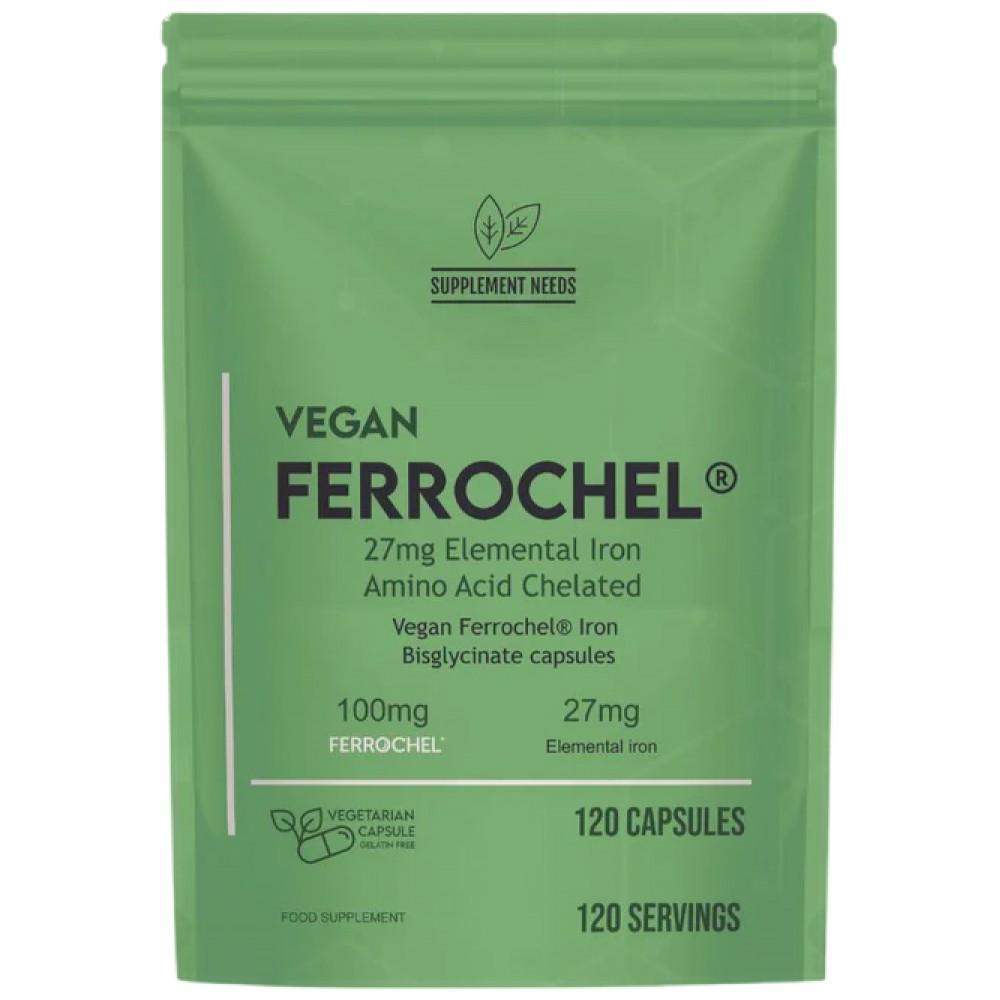 Vegan Ferrochel Iron Bisglycinate капсулите са напълно прозрачни, непритежаващи патентовани съставки и предлагат ефективна доза като част от продуктовата линия Supplement Needs Vegan Needs.